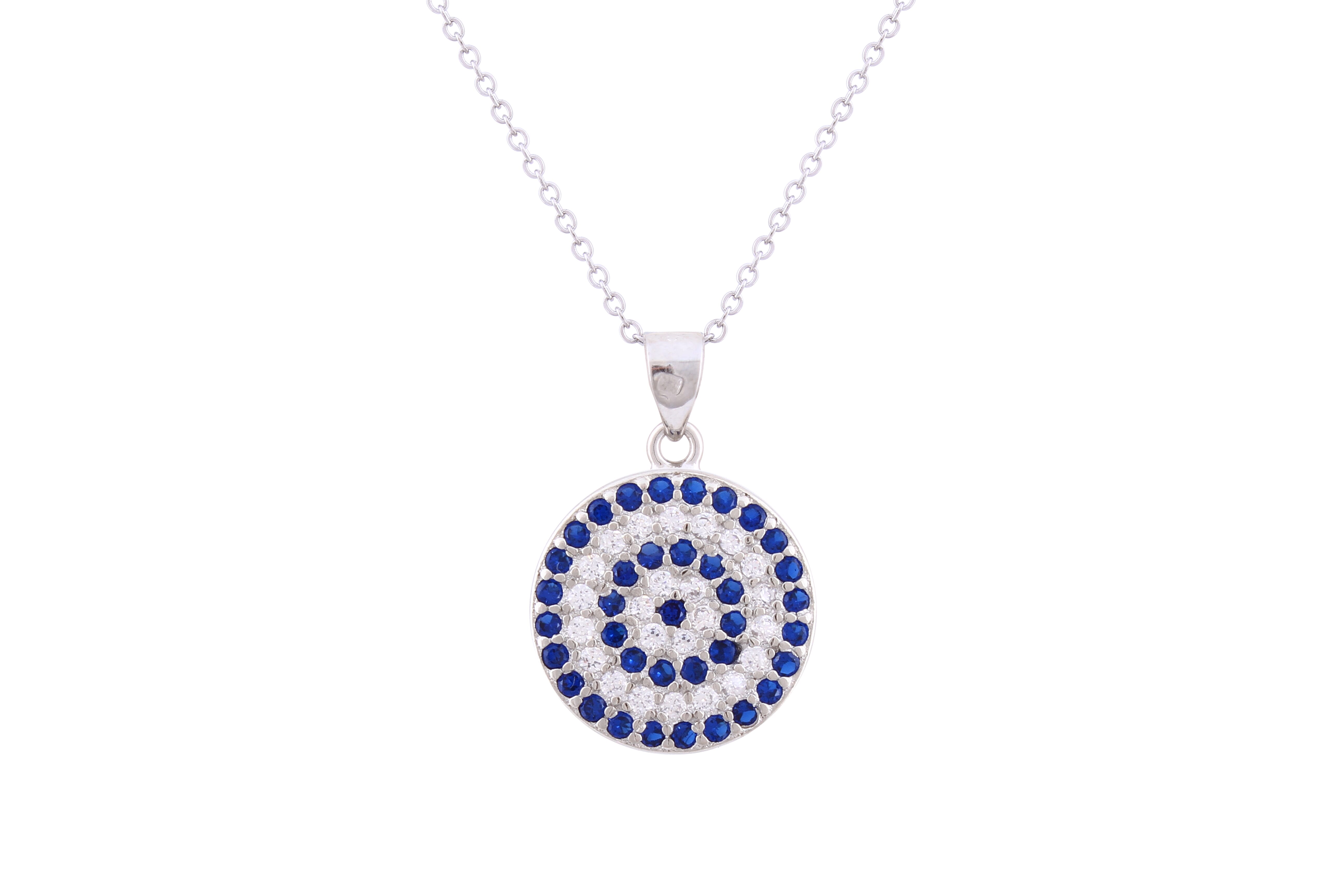 Asfour Crystal Chain Necklace With Blue & Clear Round Pendant In 925 Sterling Silver ND0214-WB