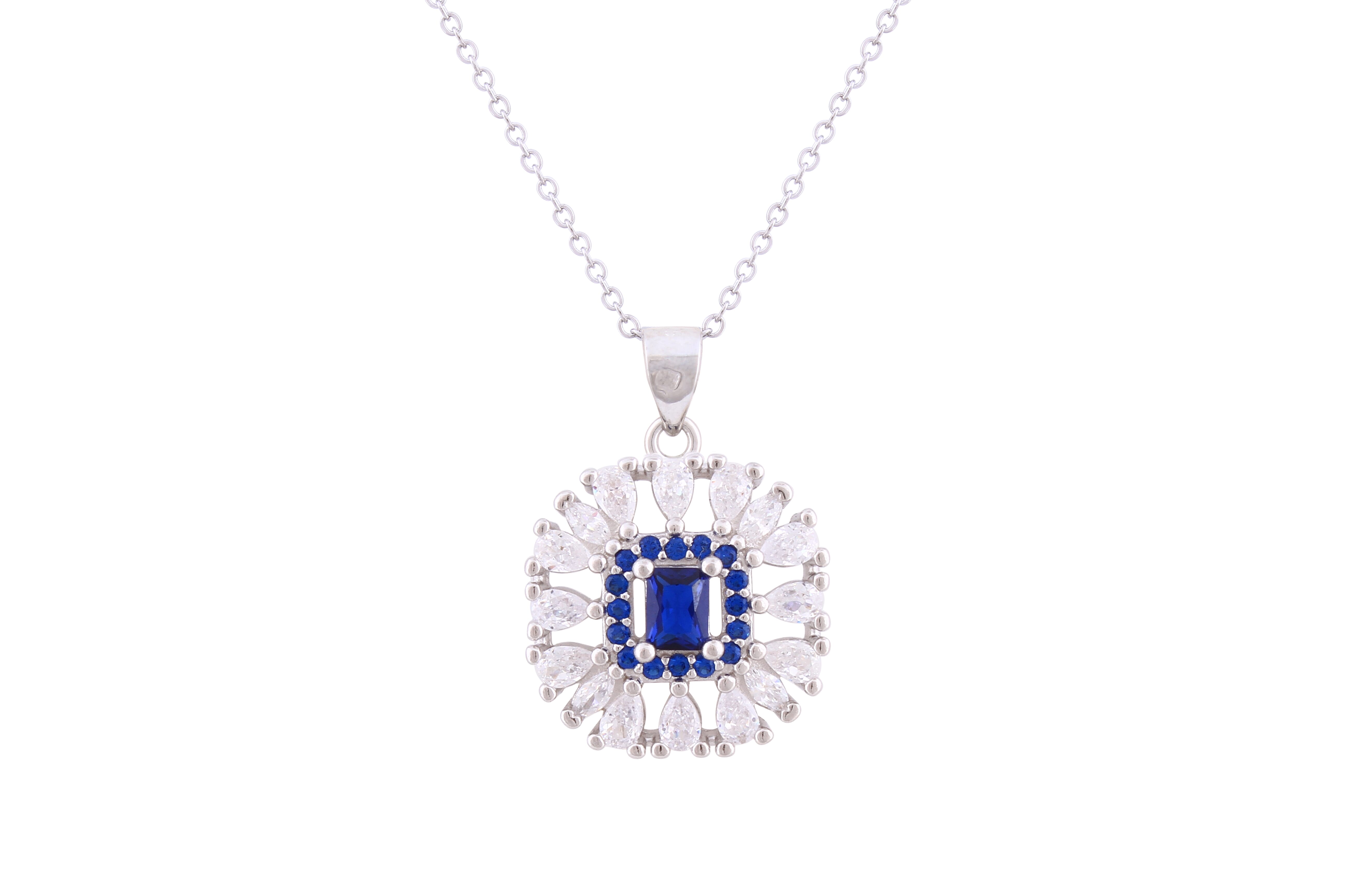 Asfour Crystal Chain Necklace With Blue Square Design In 925 Sterling Silver ND0272-WB