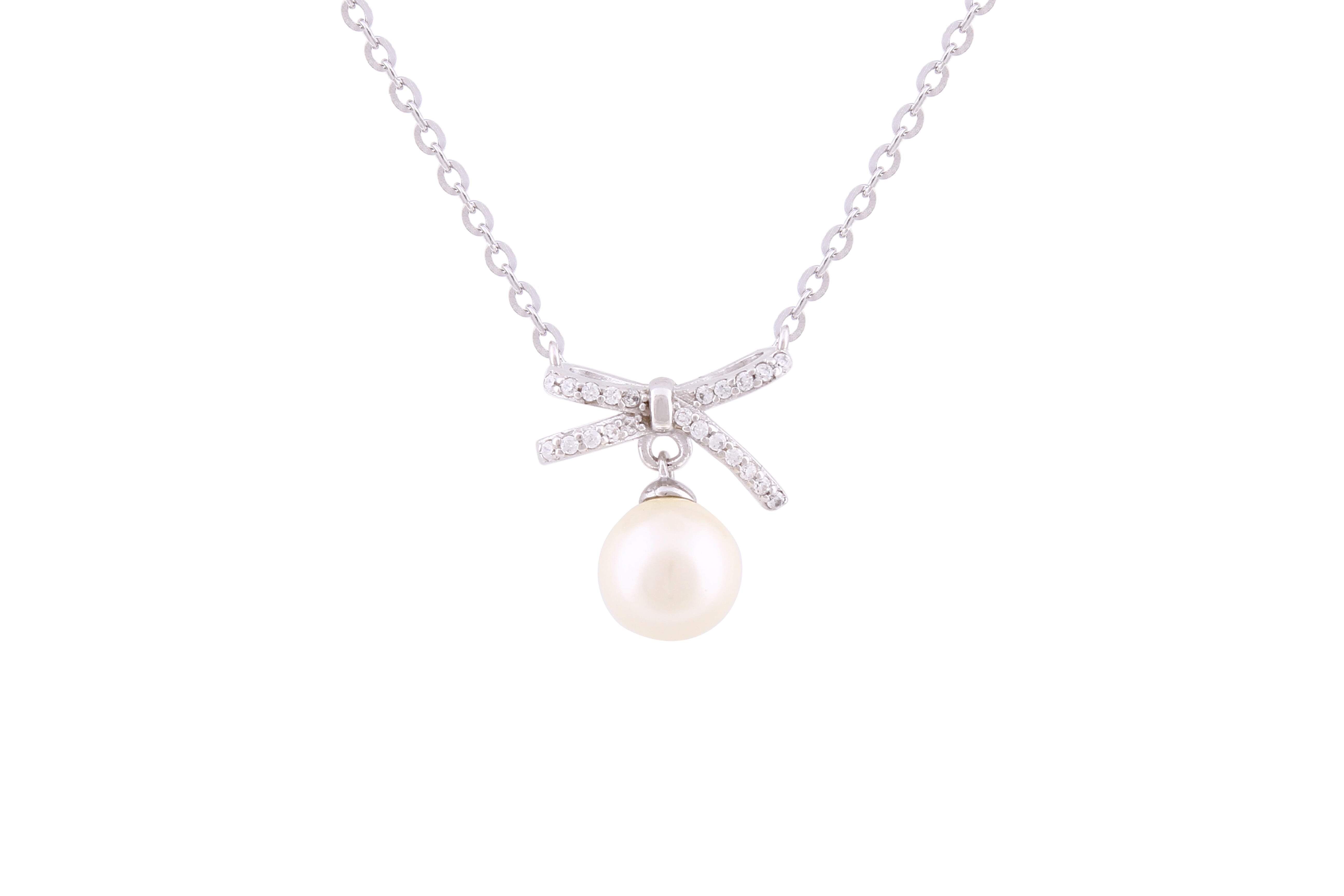 Asfour Crystal Chain Necklace With Bowknot Inlaid With Pearl Pendant In 925 Sterling Silver ND0242