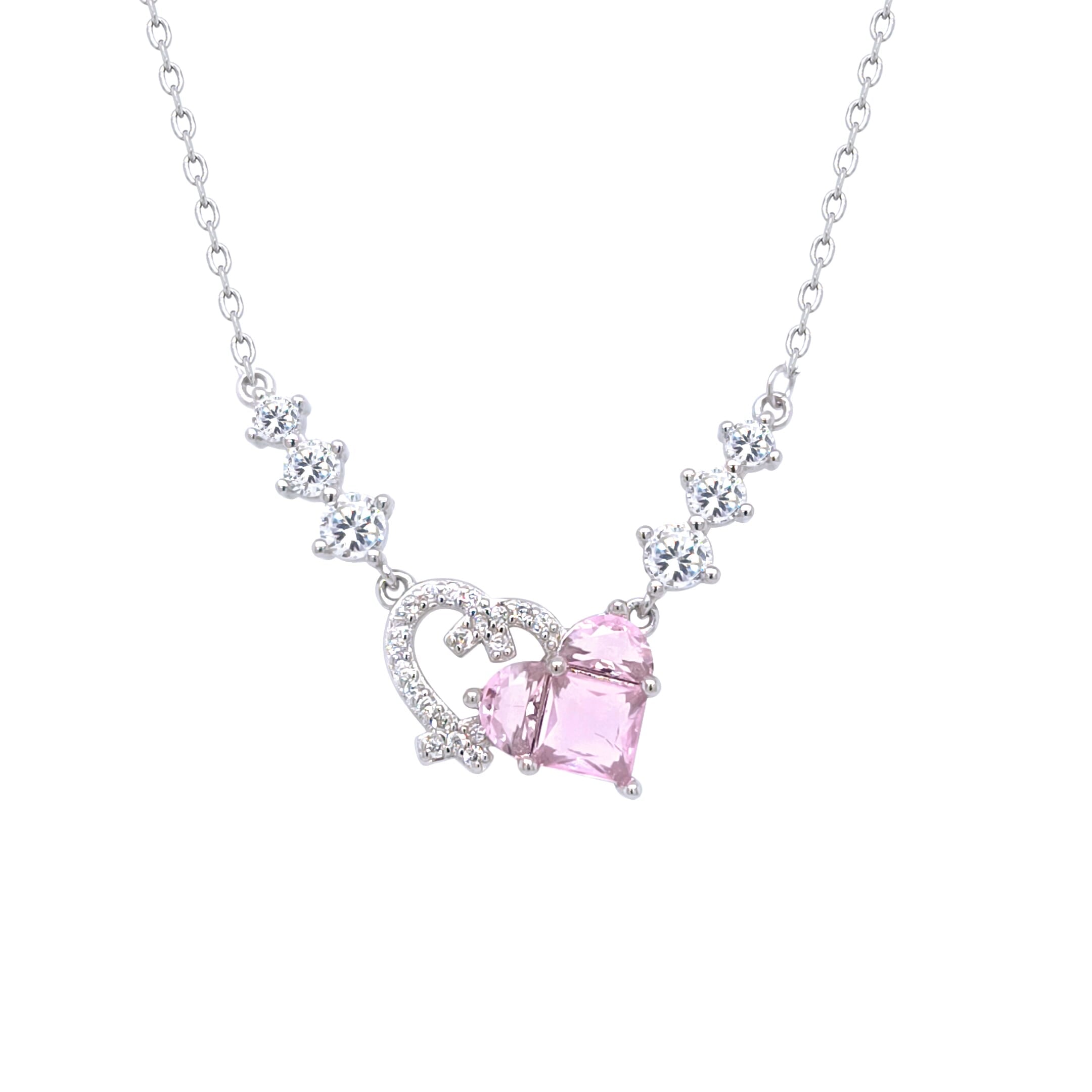 Asfour Crystal Chain Necklace With Decorative & Rose Hearts Pendant In 925 Sterling Silver-NR0560-WO