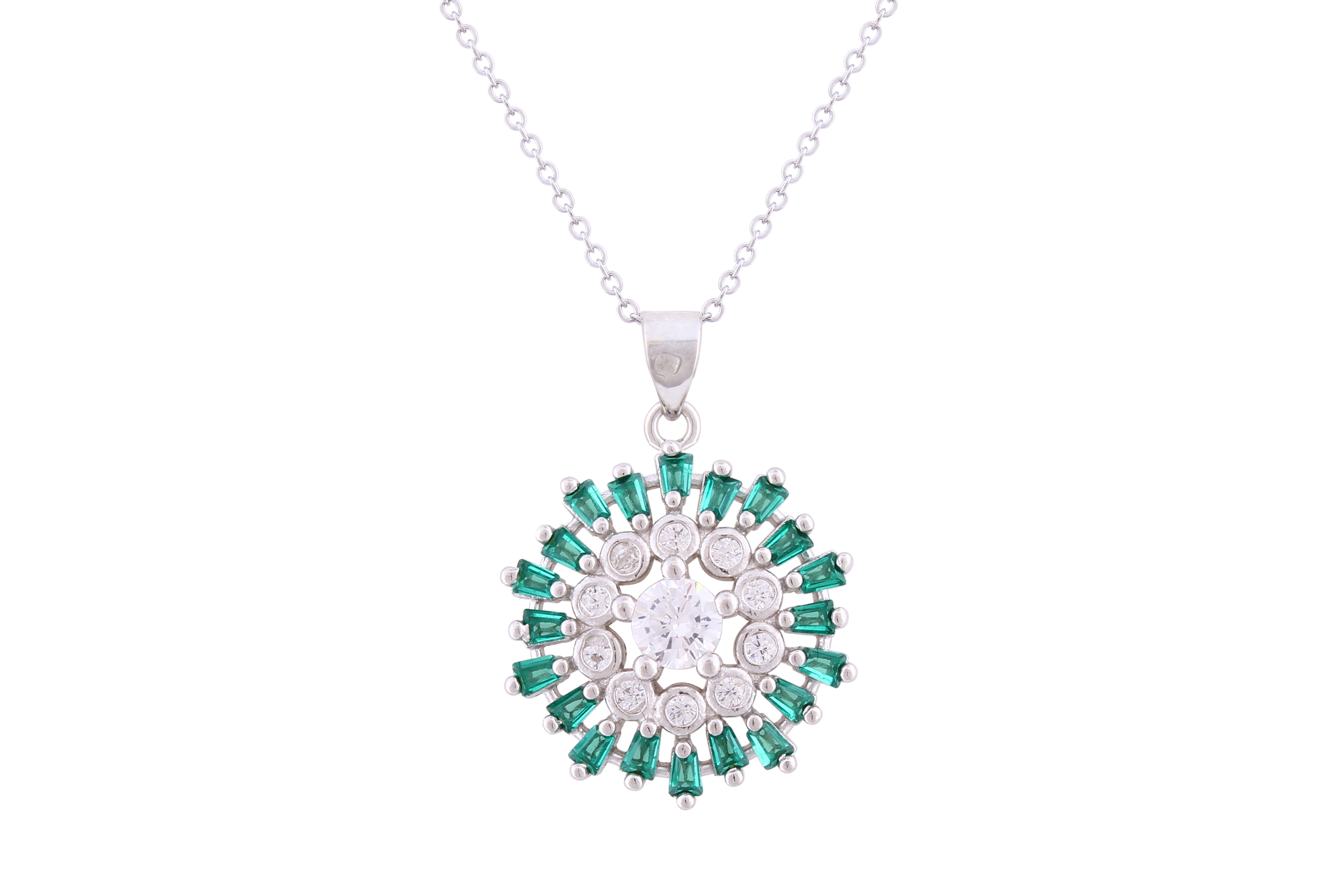 Asfour Crystal Chain Necklace With Emerald Round Flower Pendant In 925 Sterling Silver ND0266-WG