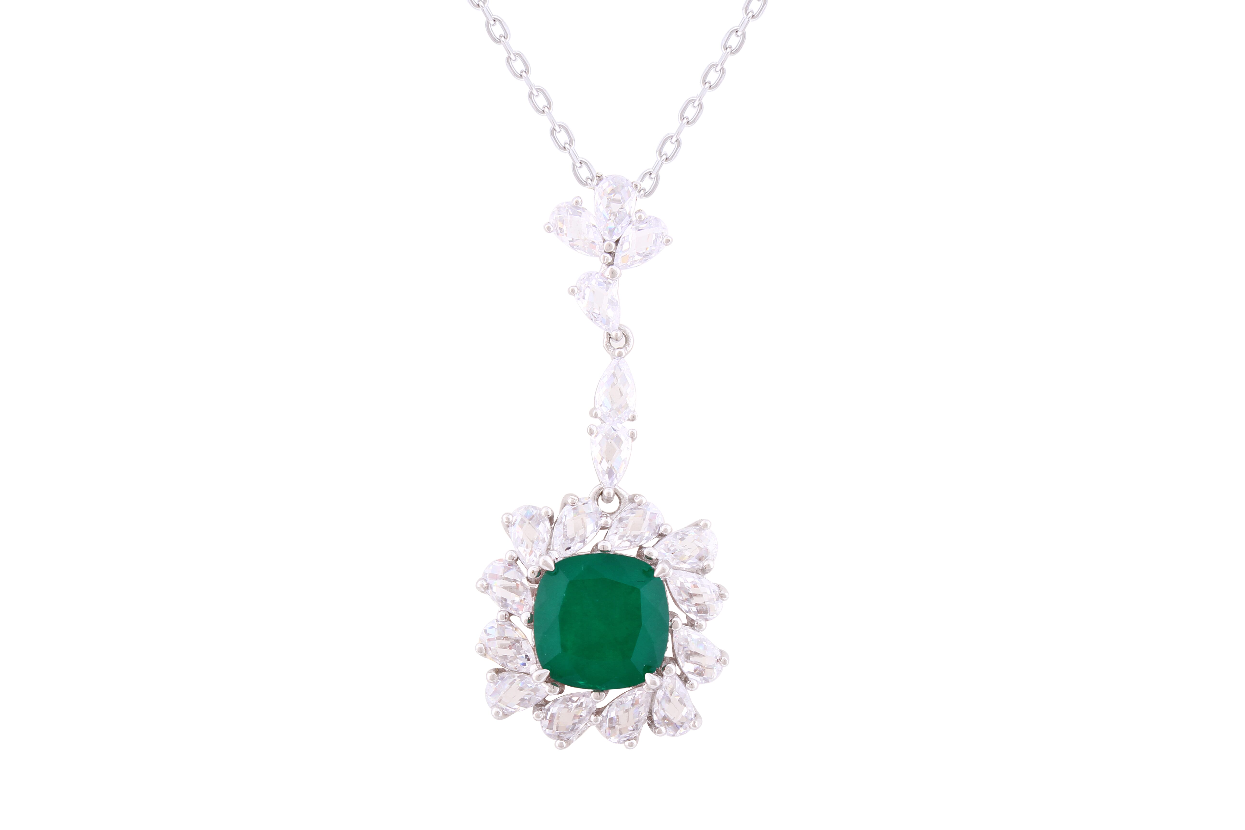 Asfour Crystal Chain Necklace With Emerald Square Halo Pendant In 925 Sterling Silver-ND0295-WG