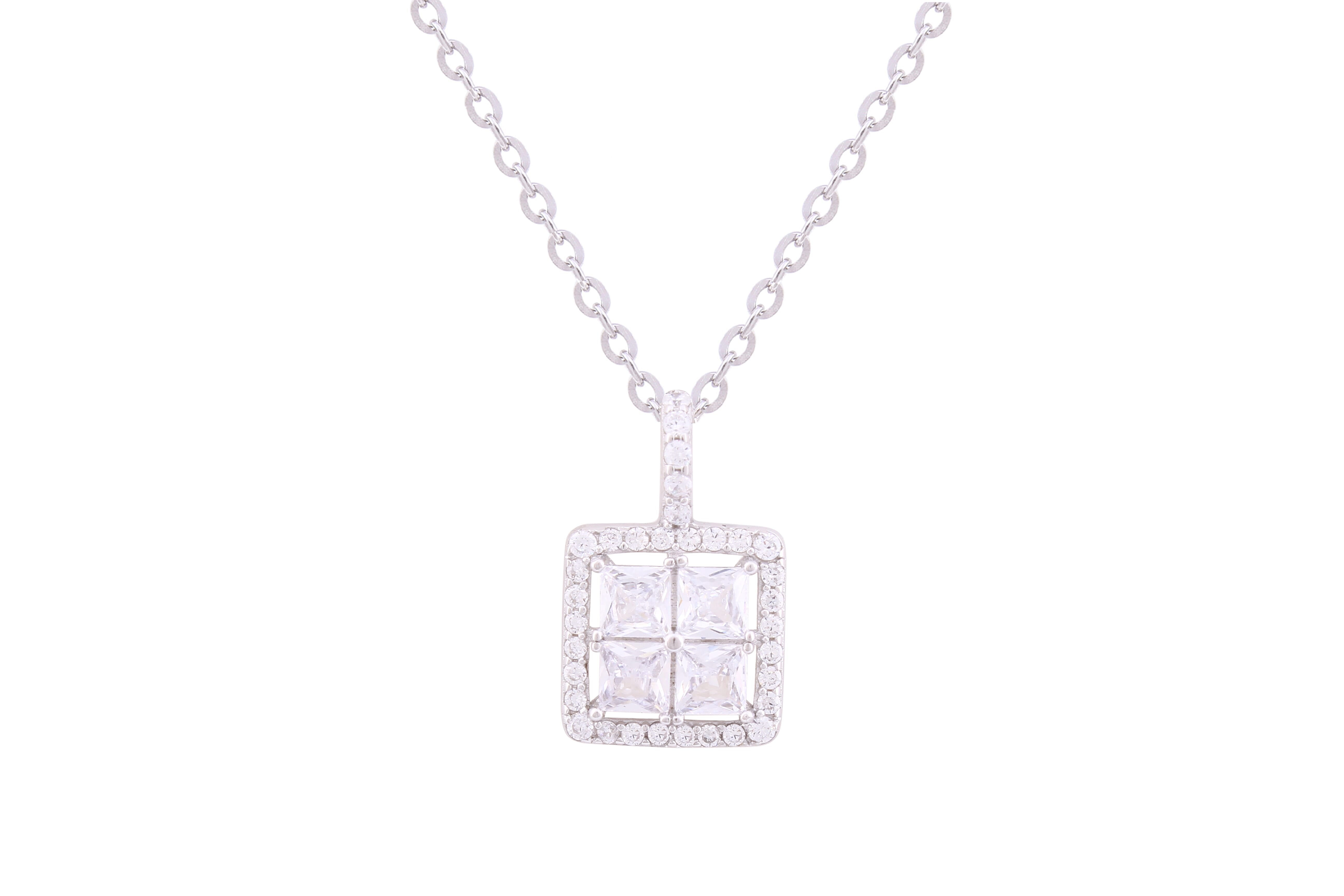 Asfour Crystal Chain Necklace With Princess Halo Pendant In 925 Sterling Silver ND0257