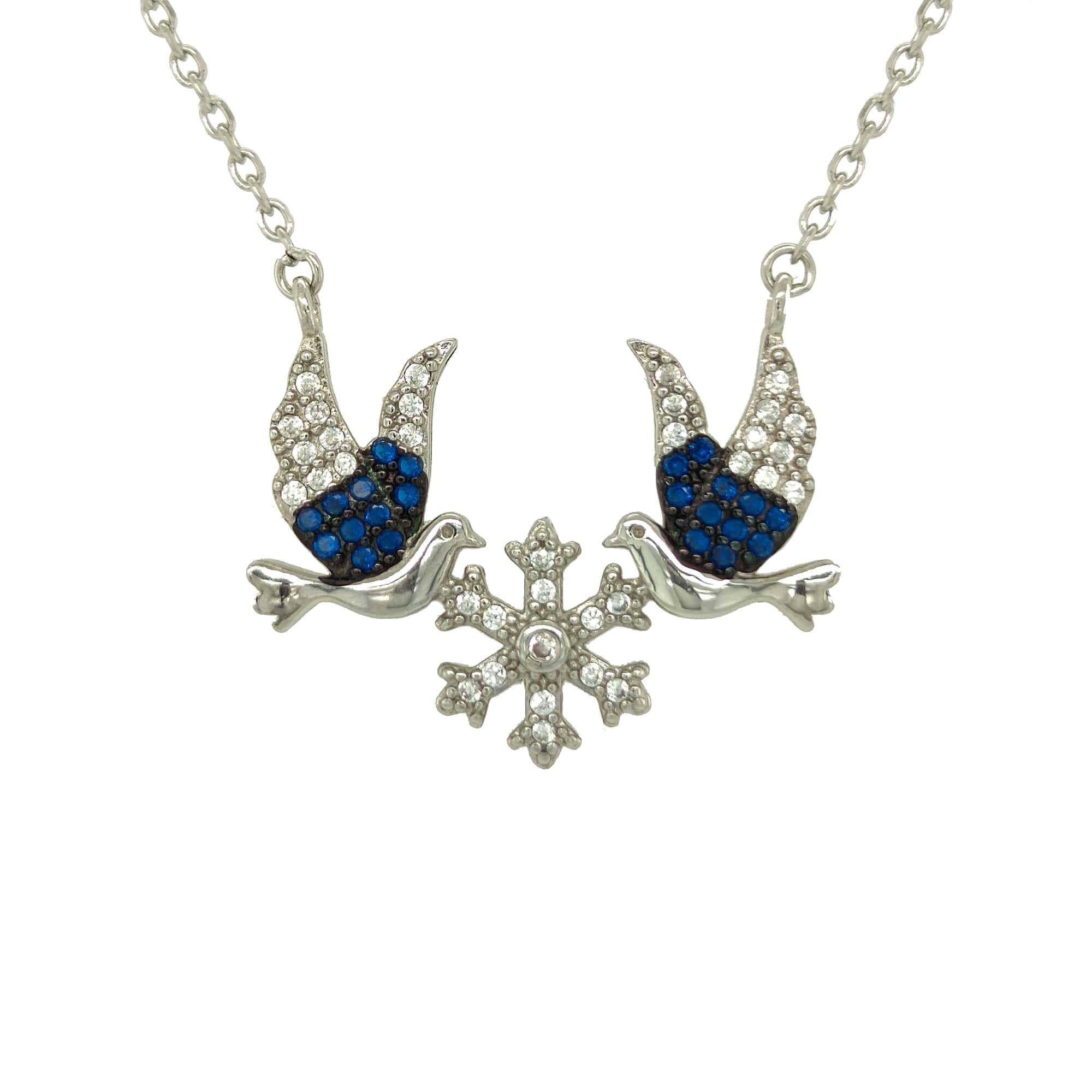 Asfour Crystal Chain Necklace With Two Birds & Snowflake Pendant In 925 Sterling Silver-NR0248-B