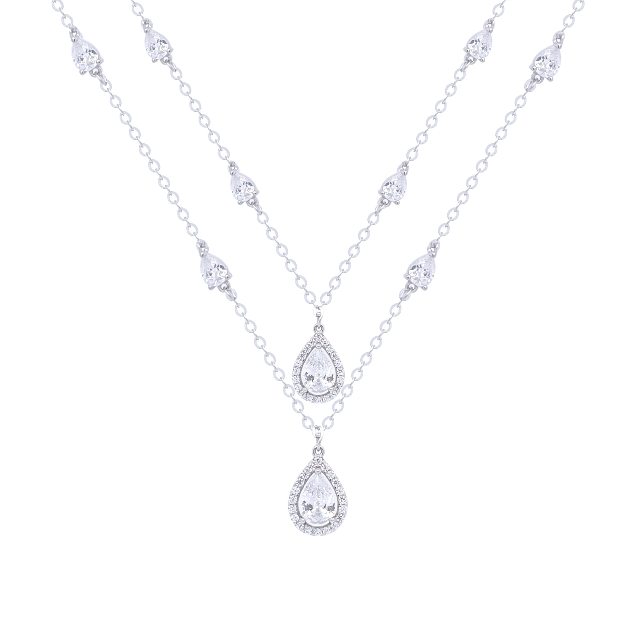 Asfour Crystal Double Layer Chain Necklace With Pear Pendant In 925 Sterling Silver-ND0358