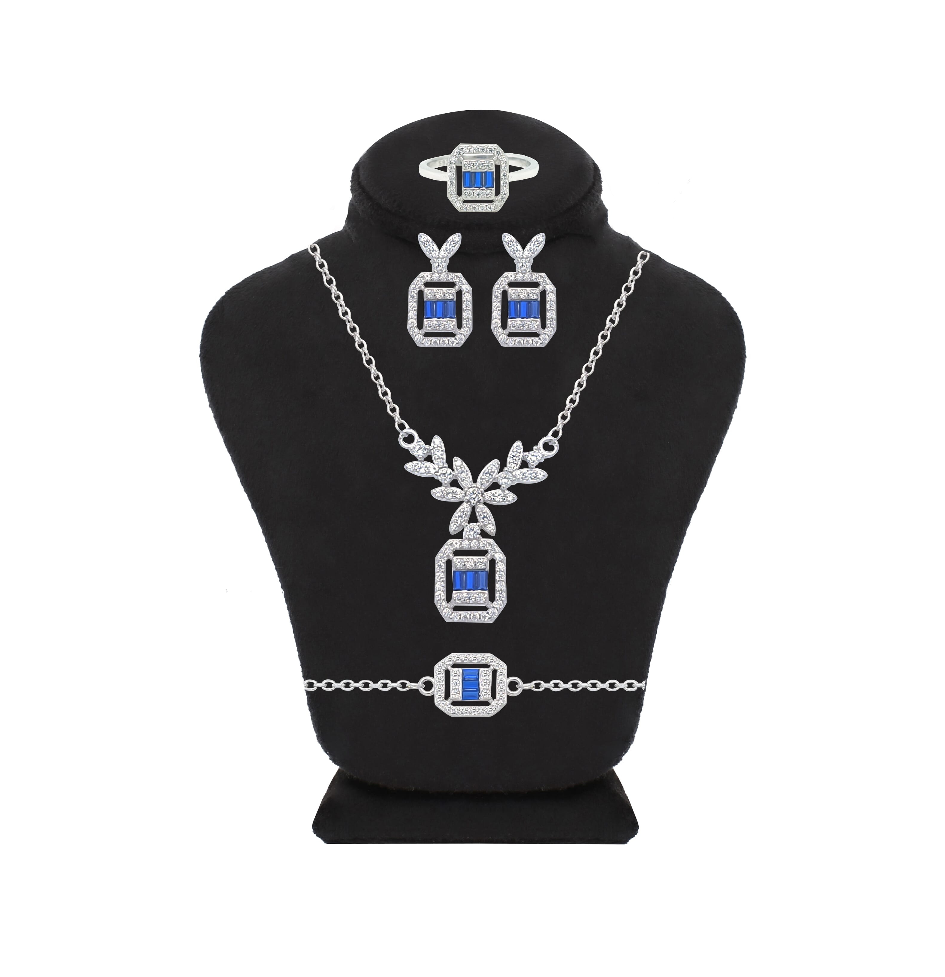 Asfour Crystal  Jewelry Set Of Necklace & Bracelet & Earrings And Ring With Blue Decorative Design Inlaid With Zircon In 925 Sterling Silver-SD0016-WB-8