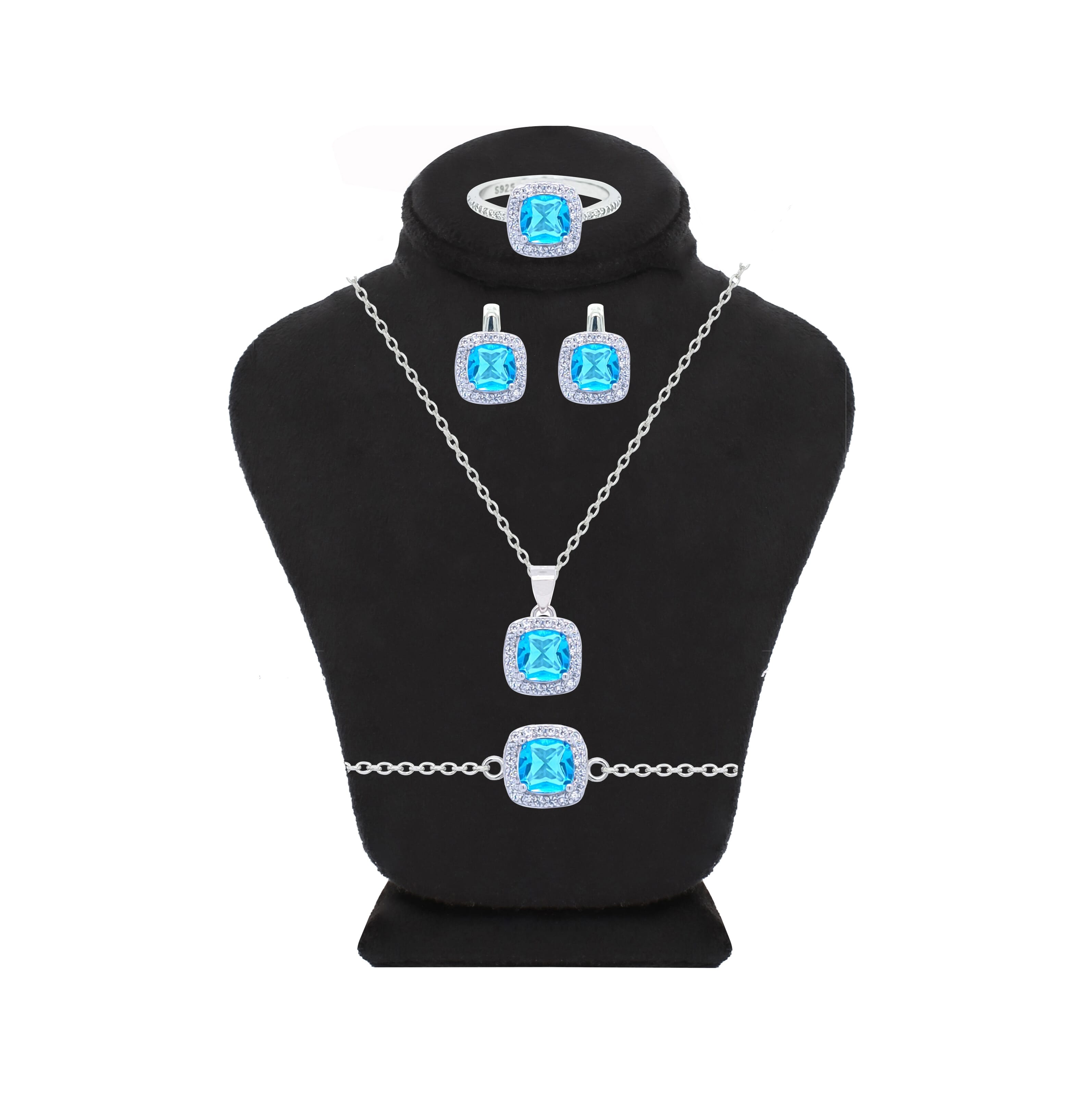 Asfour Crystal Jewelry Set Of Necklace & Bracelet & Earrings And Ring With Decorative Aquamarine Round zircon In 925 Sterling Silver-SD0024-M-9