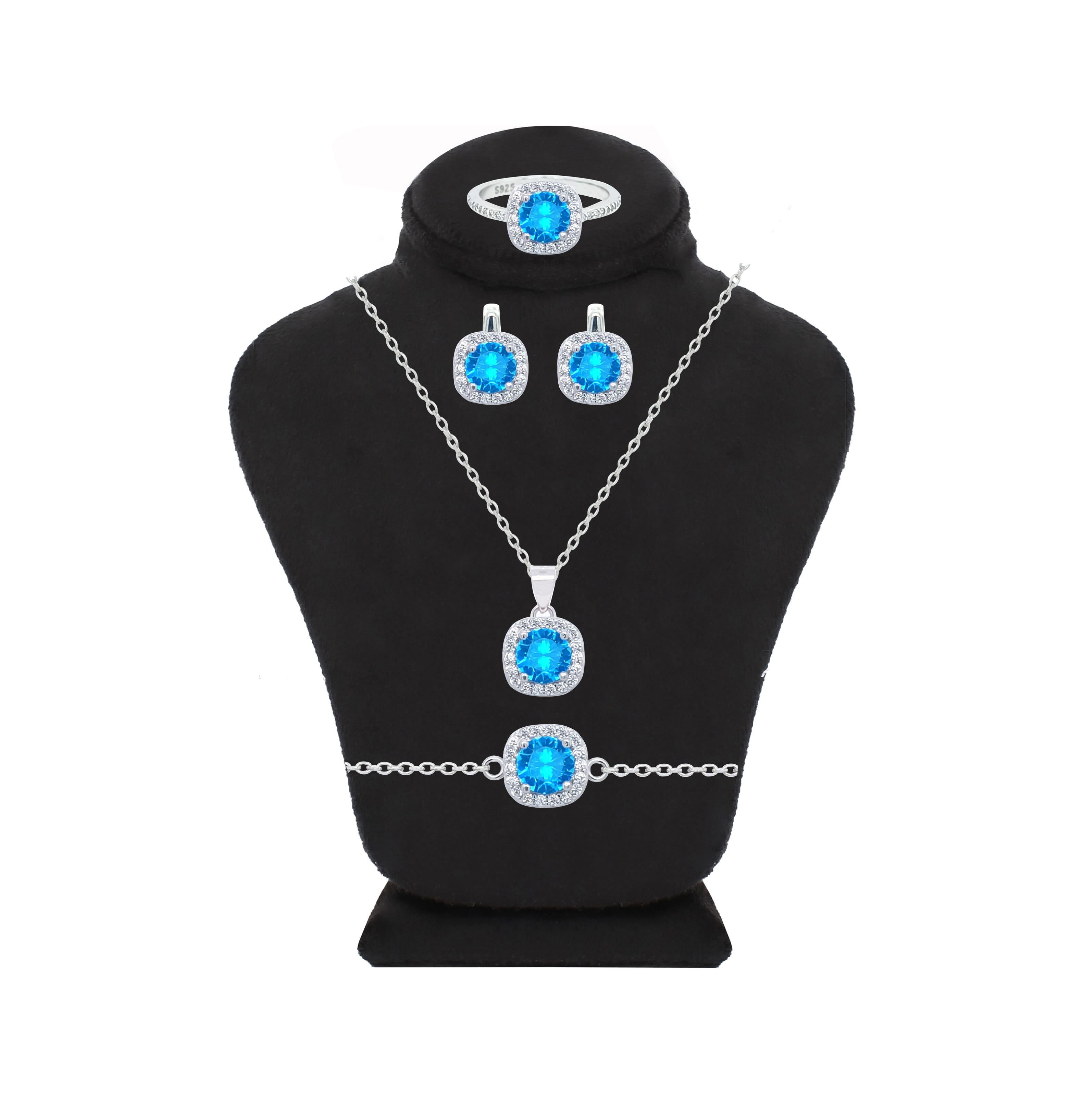 Asfour Crystal Jewelry Set Of Necklace & Bracelet & Earrings And Ring With Decorative Aquamarine Round zircon In 925 Sterling Silver-SD0025-M-9