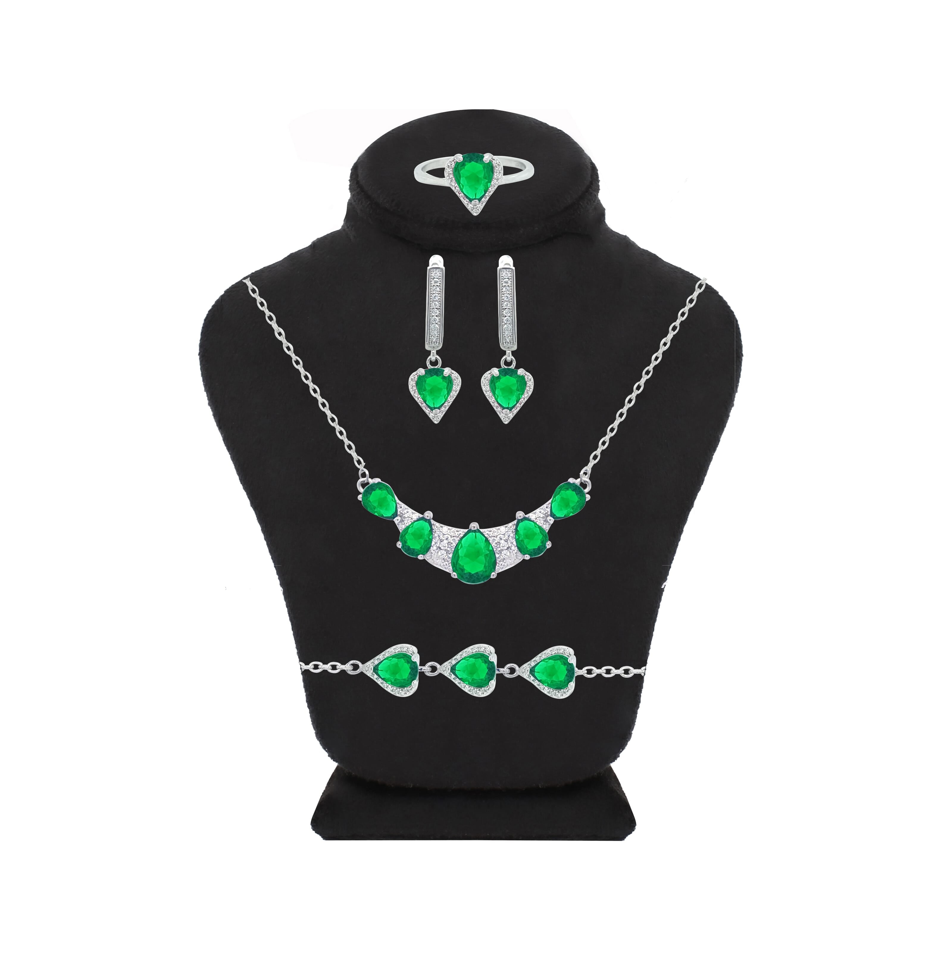 Asfour Crystal  Jewelry Set Of Necklace & Bracelet & Earrings And Ring With Decorative Emerald Pear Design In 925 Sterling Silver-SD0019-G-9