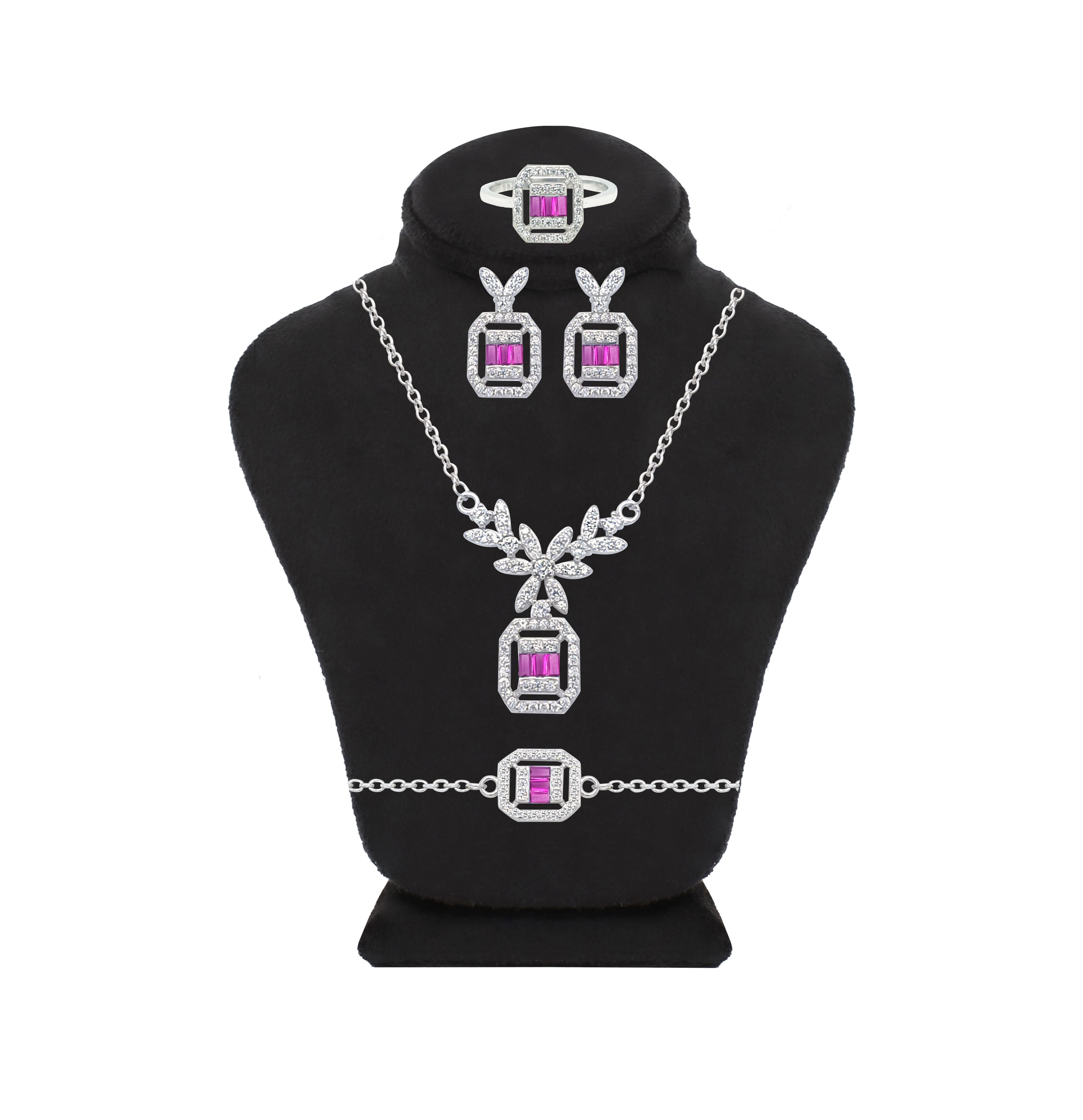 Asfour Crystal  Jewelry Set Of Necklace & Bracelet & Earrings And Ring With Fuchsia Decorative Design Inlaid With Zircon In 925 Sterling Silver-SD0016-WF-7