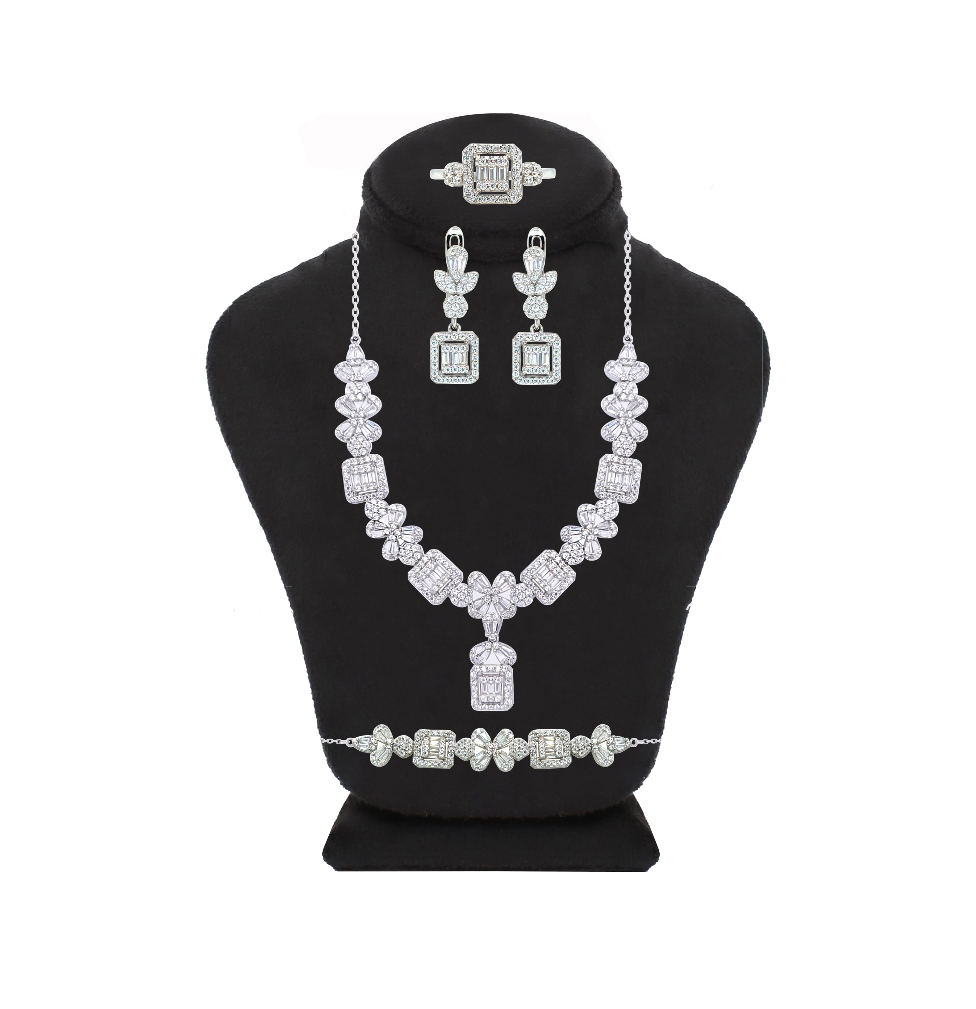 Asfour Crystal Jewelry Set Of Necklace & Bracelet & Earrings & Ring With Art Deco Design In 925 Sterling Silver-SR0119-9