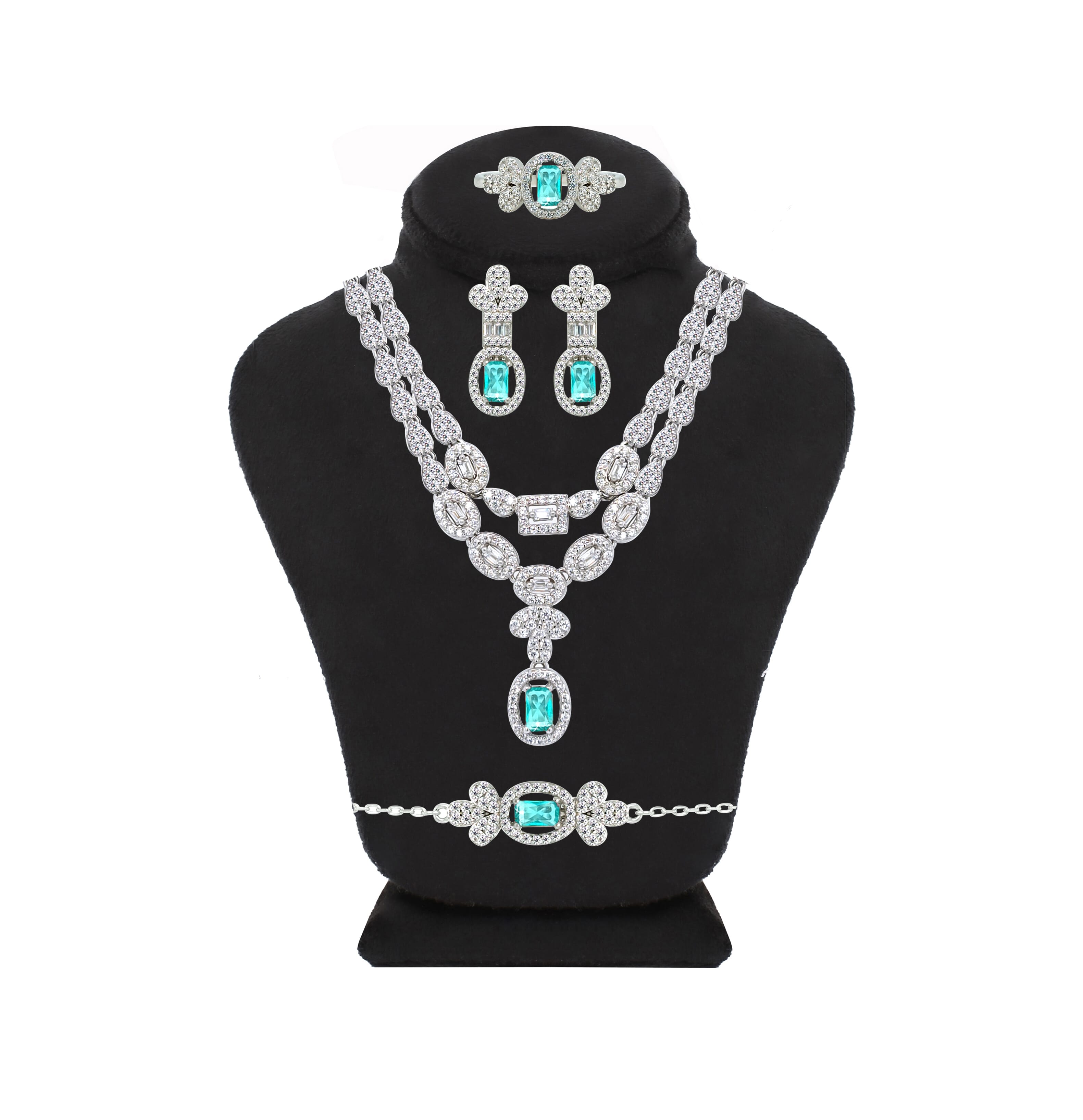 Asfour Crystal Jewelry Set Of Necklace & Bracelet & Earrings & Ring With Blue Zircon Decorative Design In 925 Sterling Silver-SR0121-WZR-9