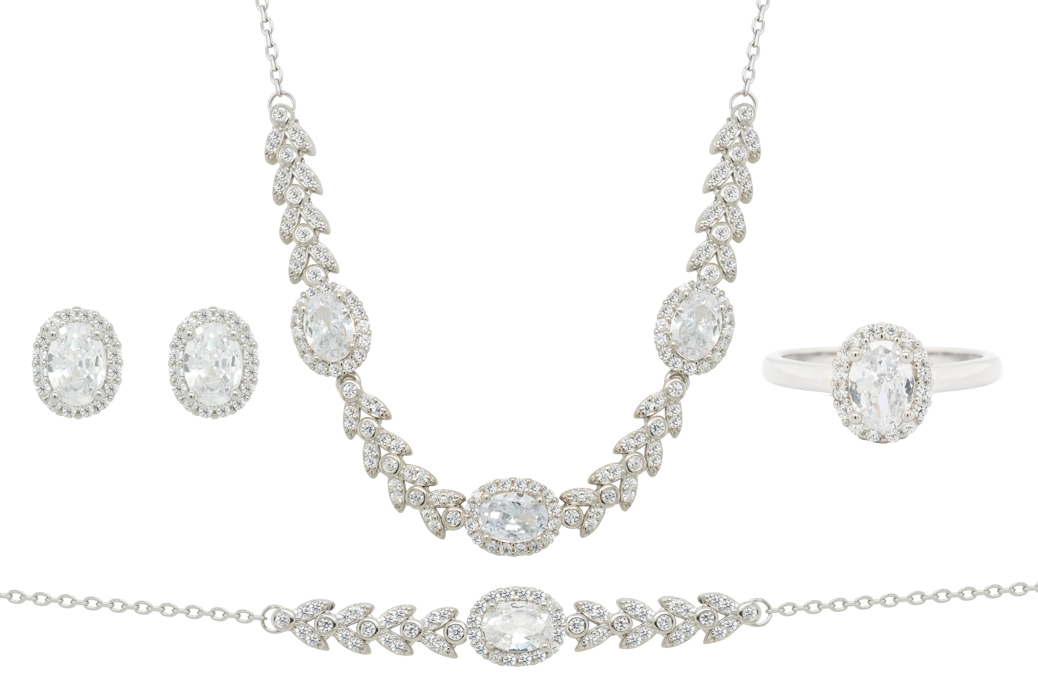 Asfour Crystal Jewelry Set Of Necklace & Bracelet & Earrings & Ring With Decorative Oval Zircon In 925 Sterling Silver-SR0114-8