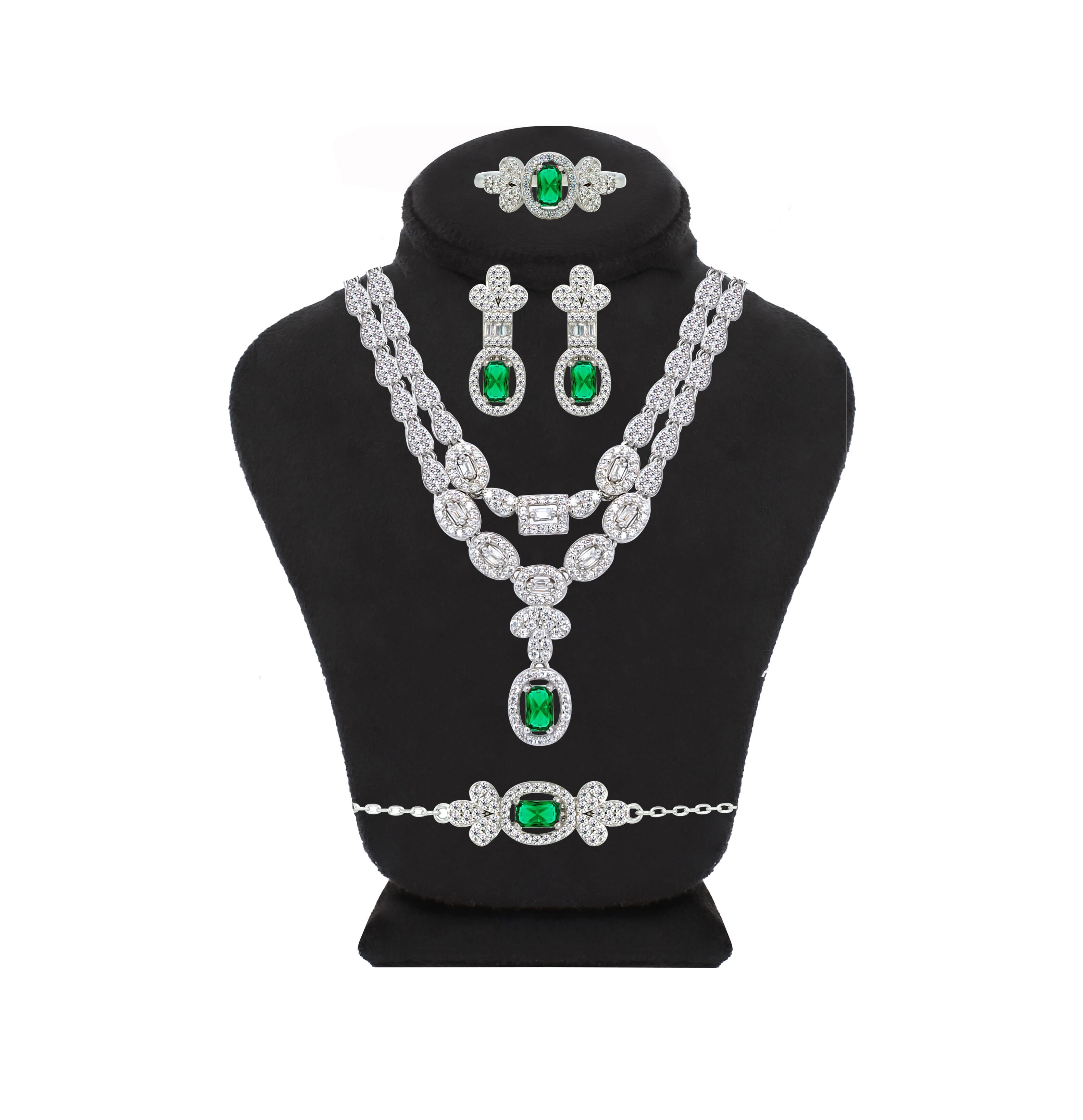 Asfour Crystal Jewelry Set Of Necklace & Bracelet & Earrings & Ring With Emerald Decorative Design In 925 Sterling Silver-SR0121-WG-9