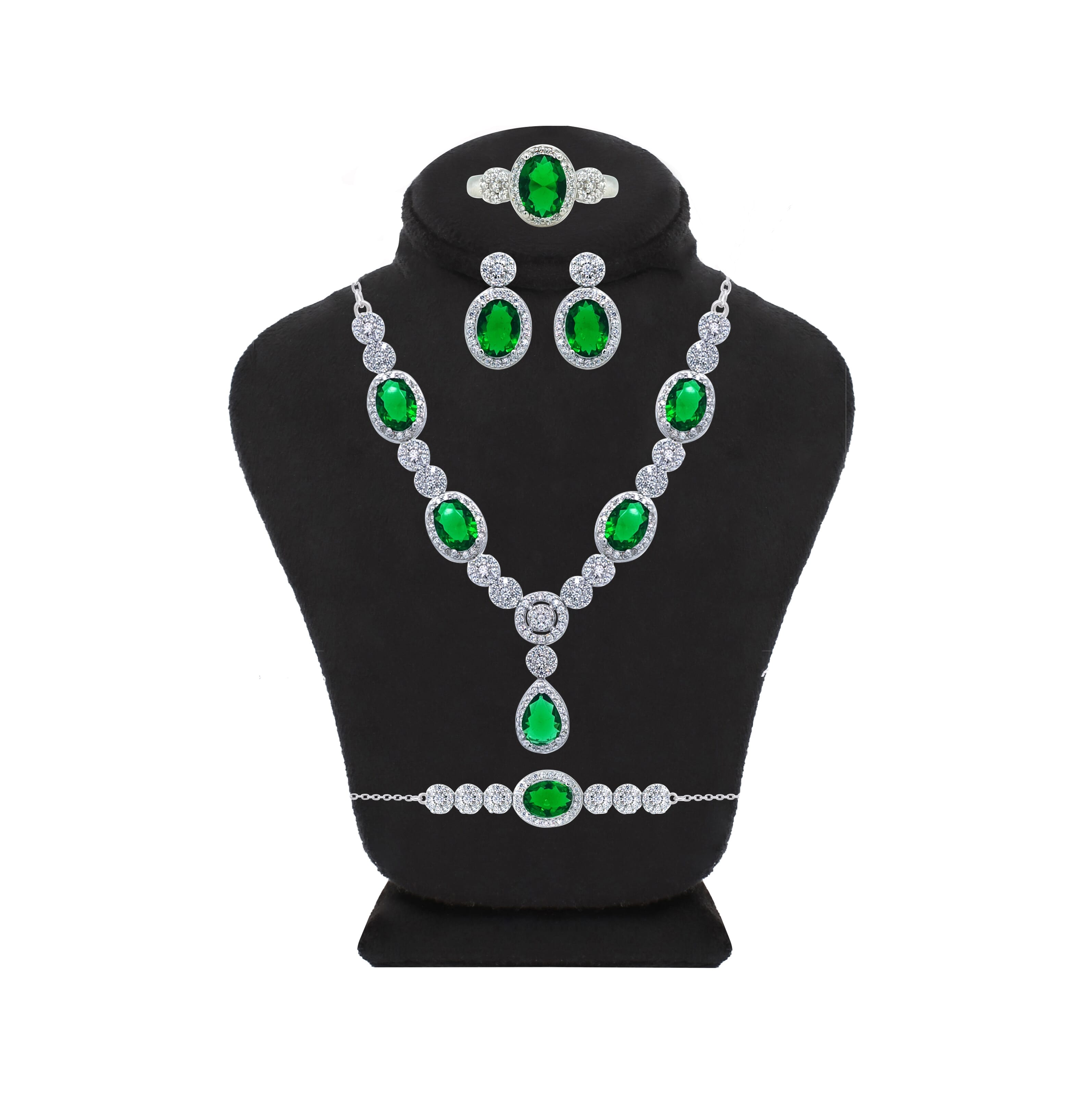 Asfour Crystal Jewelry Set Of Necklace & Bracelet & Earrings & Ring With Emerald Oval Design In 925 Sterling Silver-SR0118-G-6