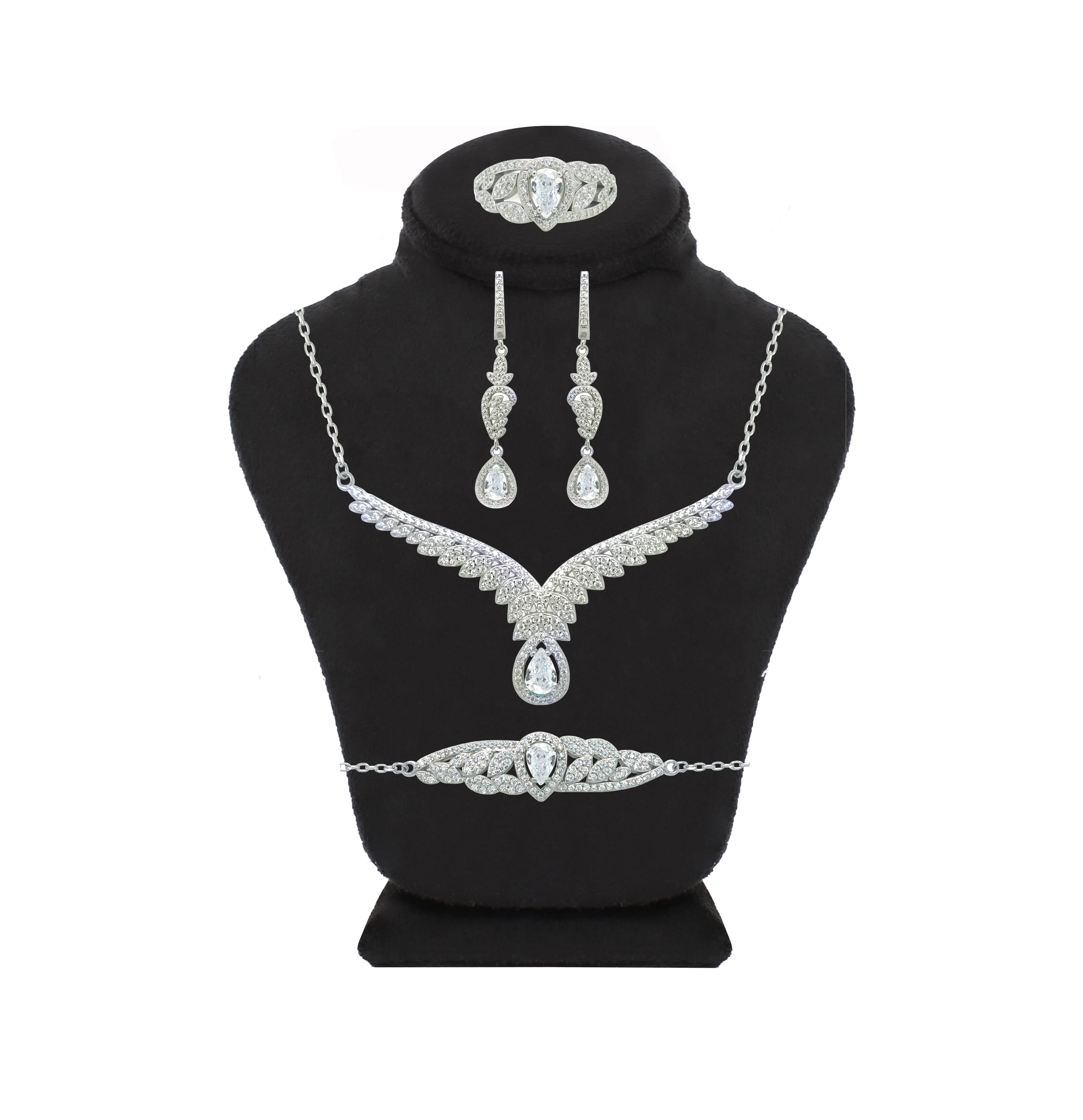 Asfour Crystal Jewelry Set Of Necklace, Earrings And Ring With Art Deco V Design in 925 Sterling Silver-SM0012-9
