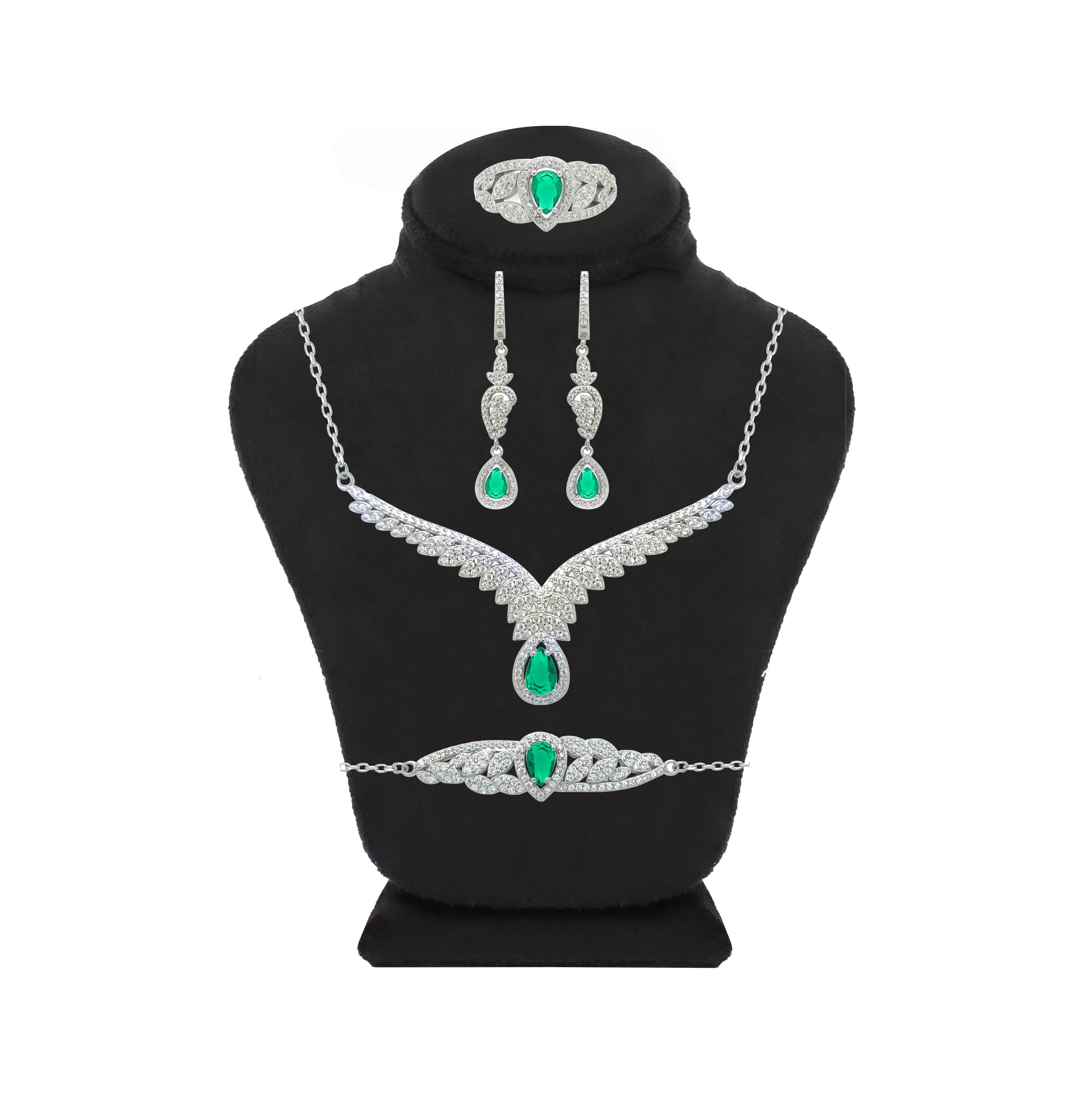 Asfour Crystal Jewelry Set Of Necklace, Earrings And Ring With Emerald Decorative V Design in 925 Sterling Silver-SM0012-WG-7