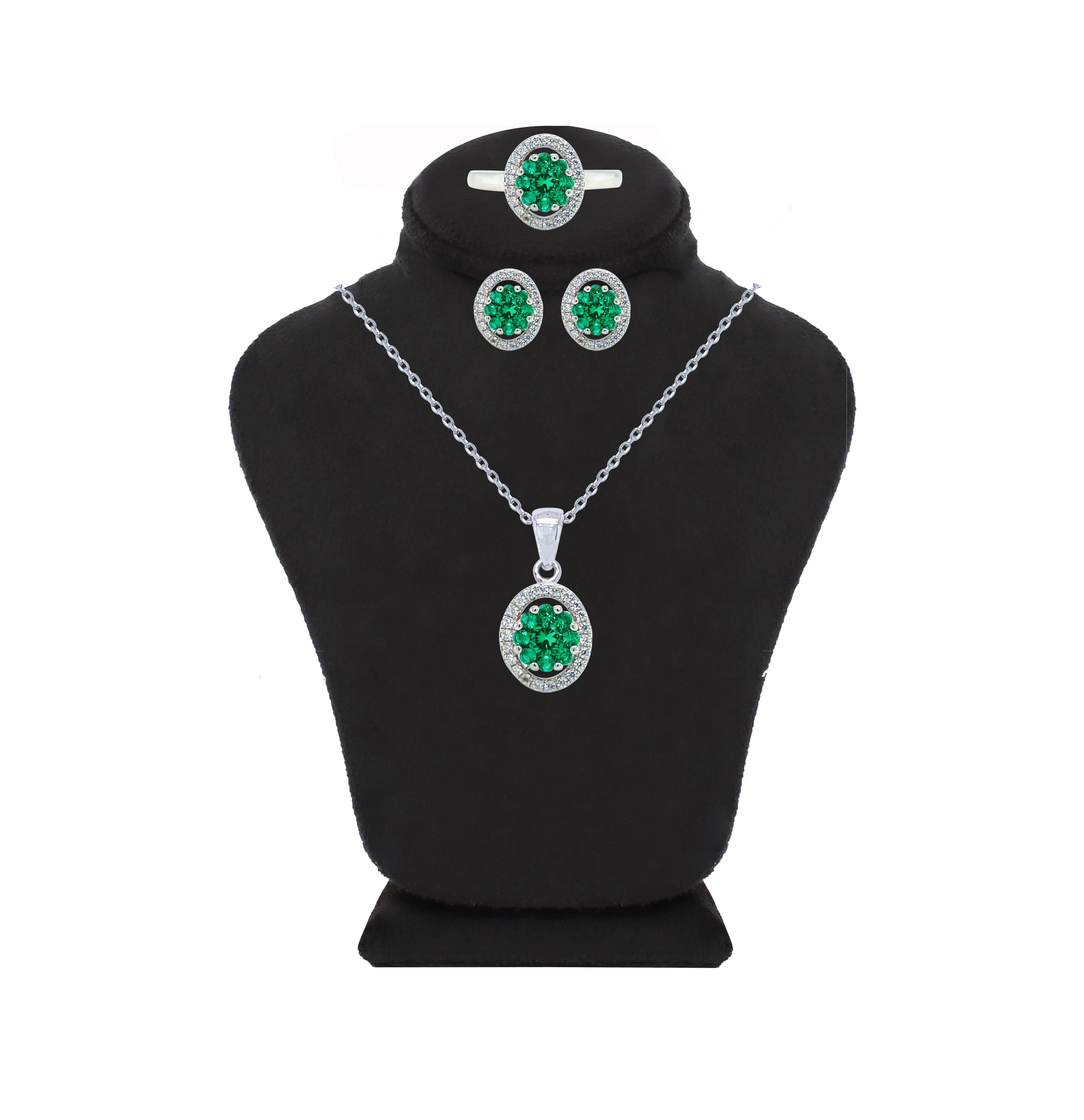Asfour Crystal Jewelry Set Of Necklace, Earrings and Ring With Emerald Oval Design in 925 Sterling Silver-SM0008-WG-7