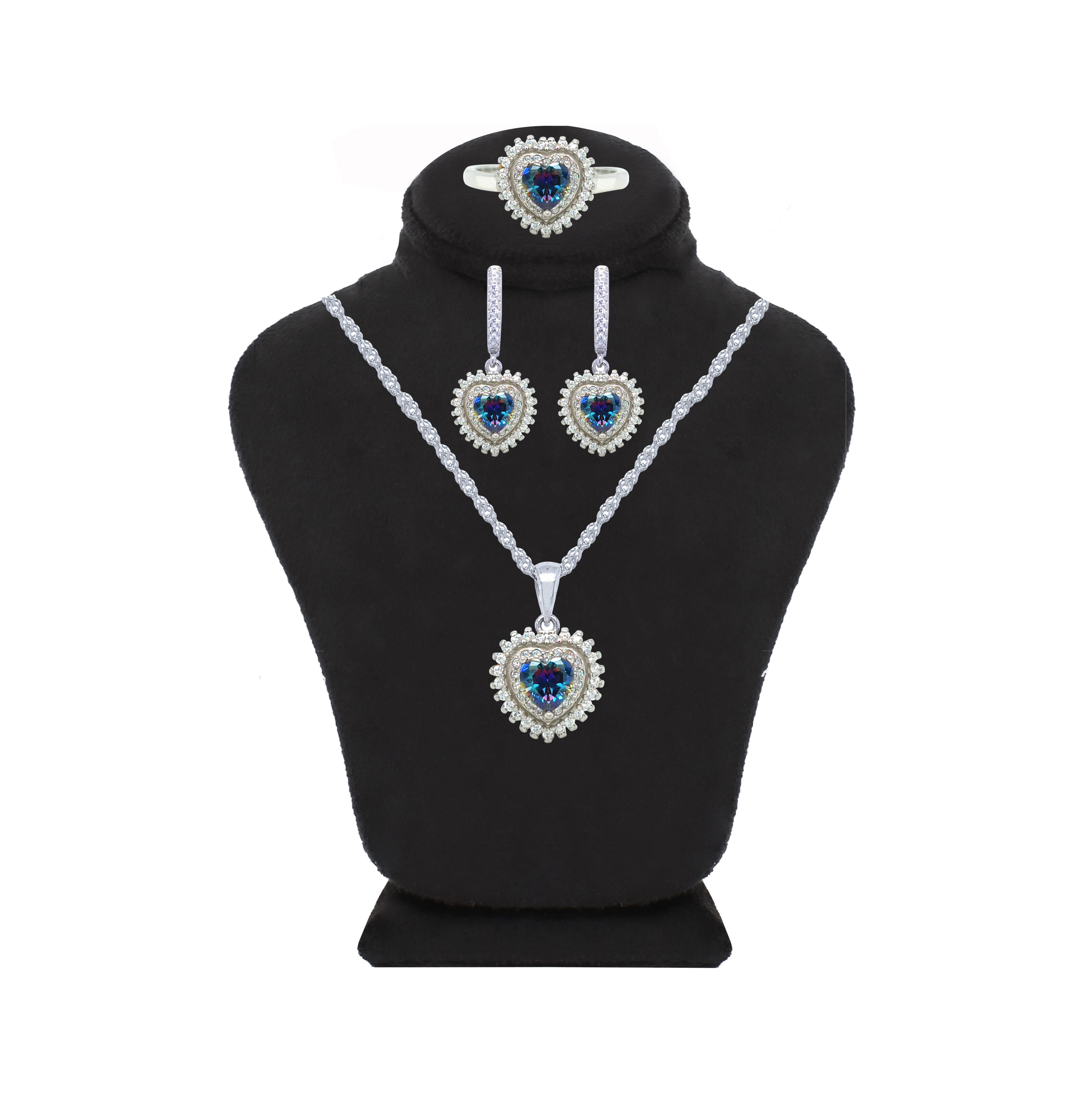 Asfour Crystal Jewelry Set Of Necklace, Earrings and Ring With Multi Color Heart Design in 925 Sterling Silver-SM0005-WAP-9