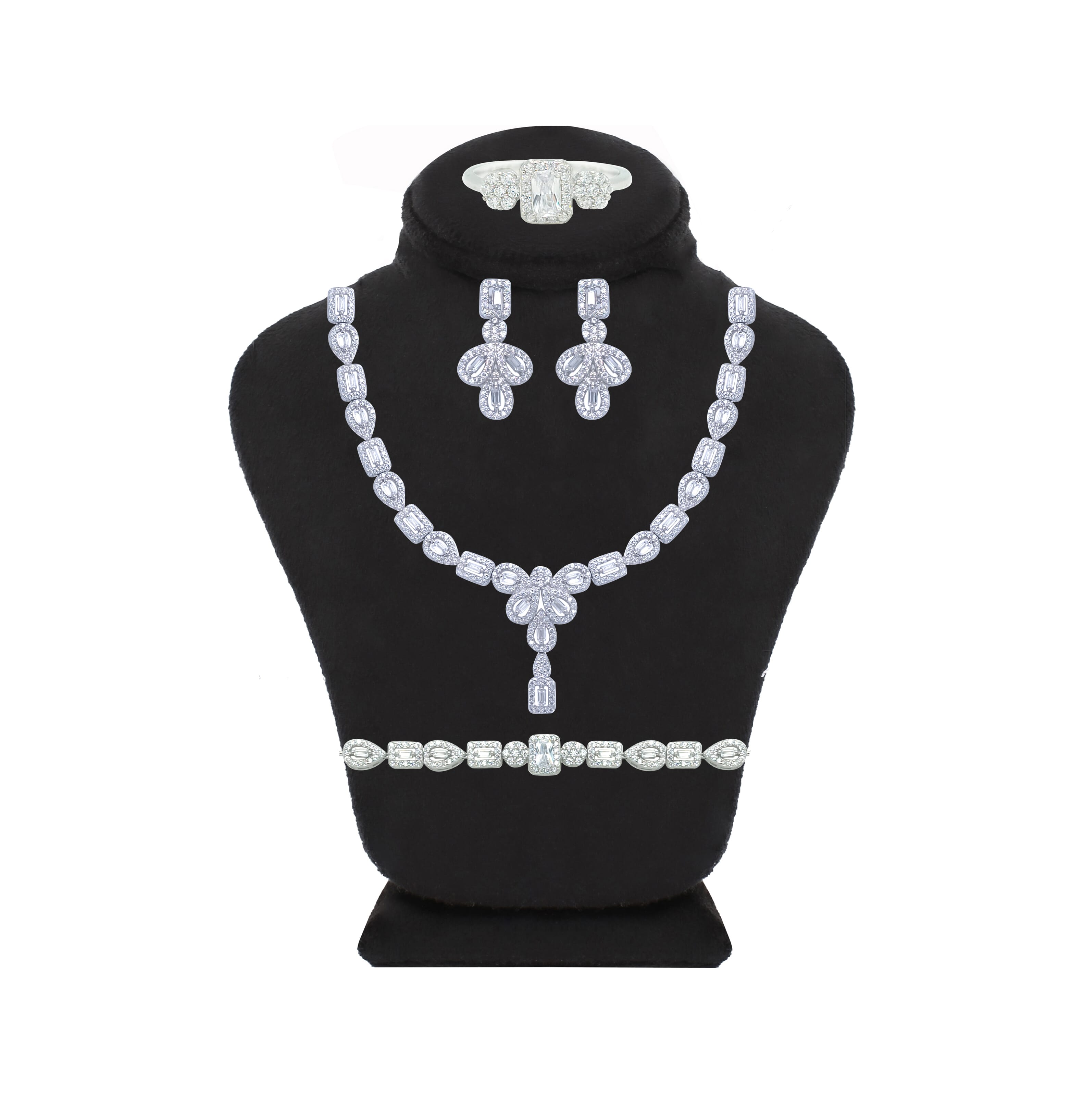 Asfour Crystal Jewelry Set Of Necklace, Earrings, Bracelet & Ring With Art Deco Design in 925 Sterling Silver-SM0009-7