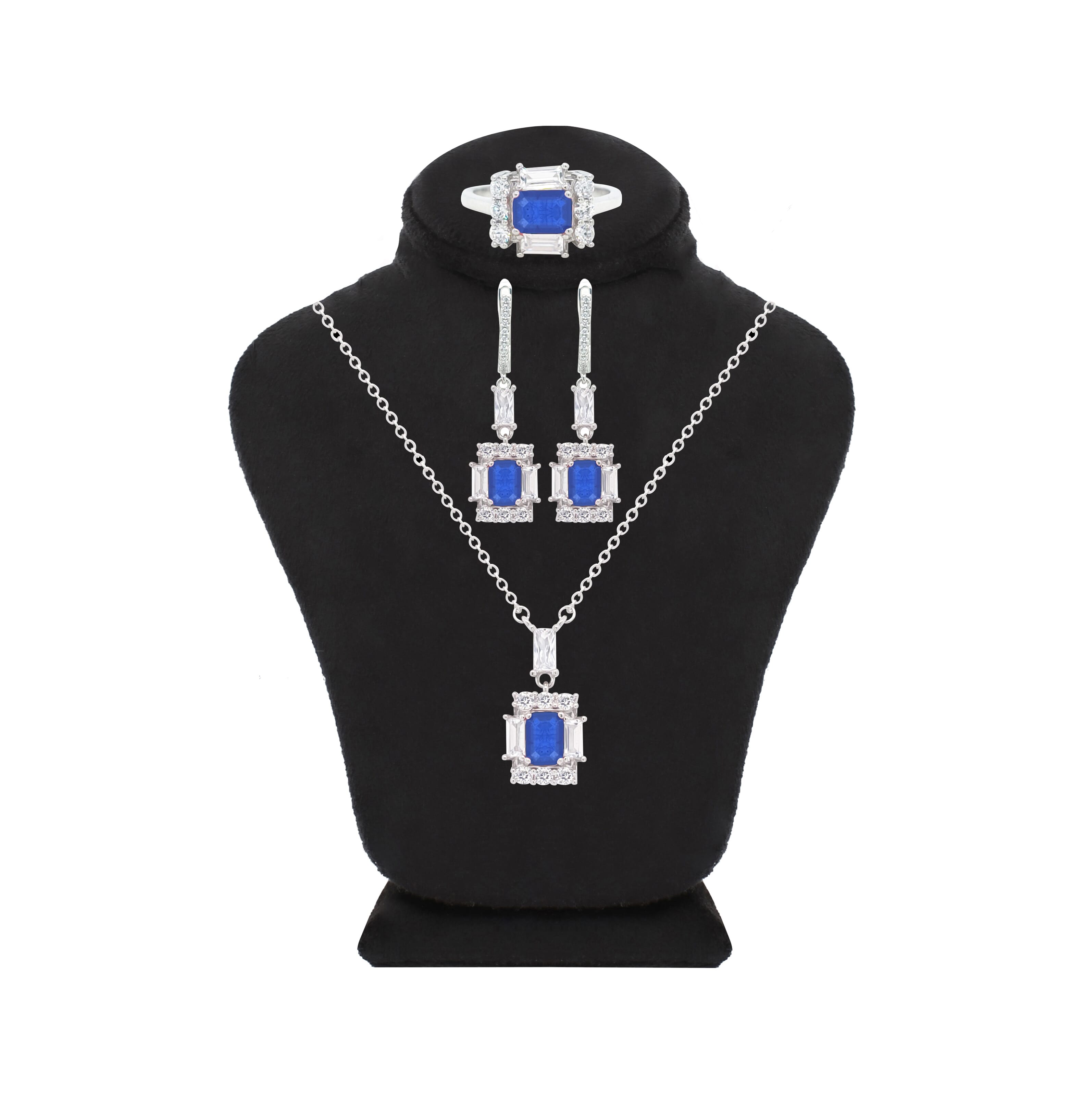 Asfour Crystal Jewelry Set Of Necklace & Earrings & Ring With Blue Decorative Emerald Design In 925 Sterling Silver-SD0017-B-6