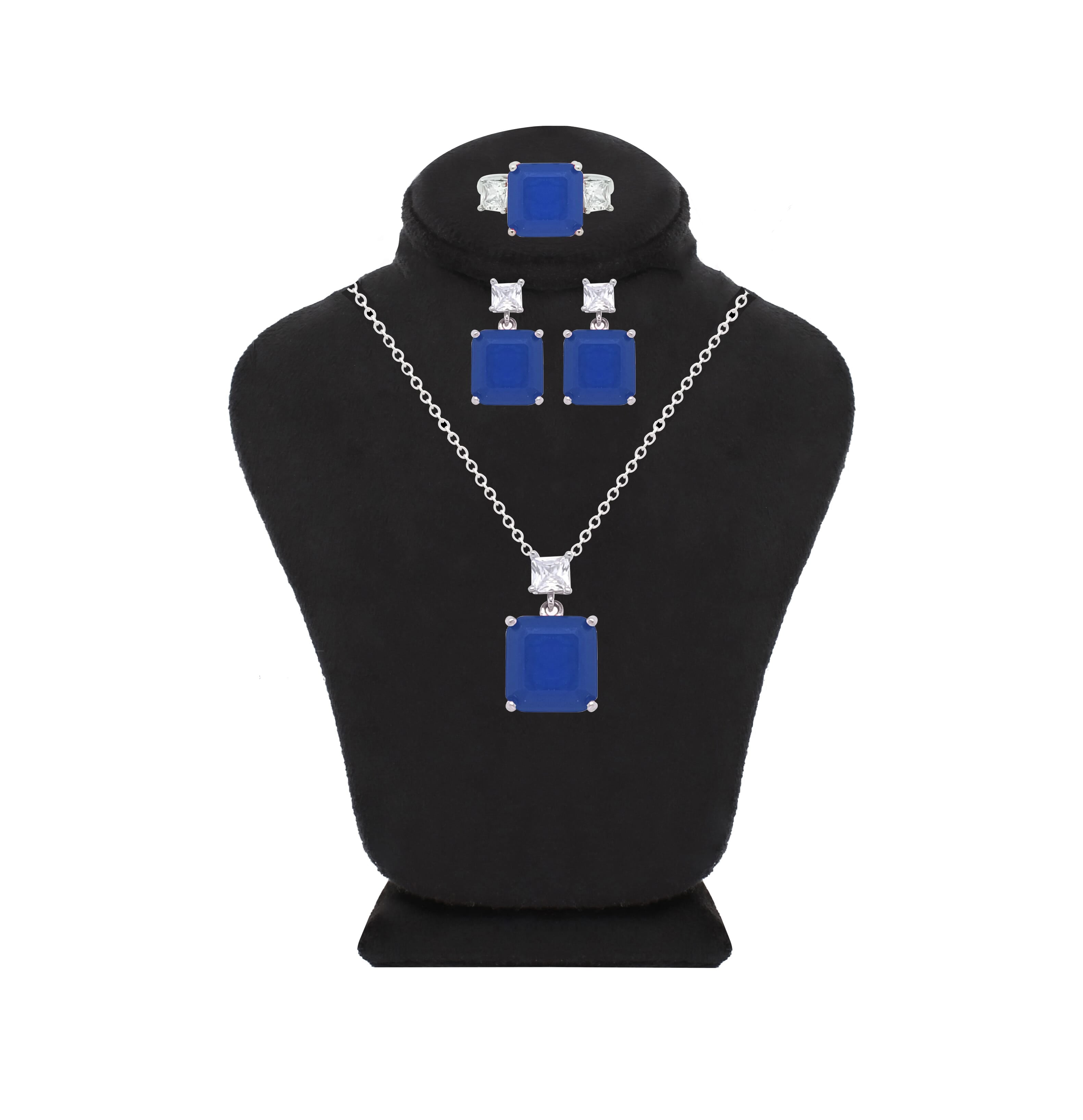 Asfour Crystal  Jewelry Set Of Necklace & Earrings & Ring With Blue Square Design Inlaid With Zircon In 925 Sterling Silver-SD0014-B-6