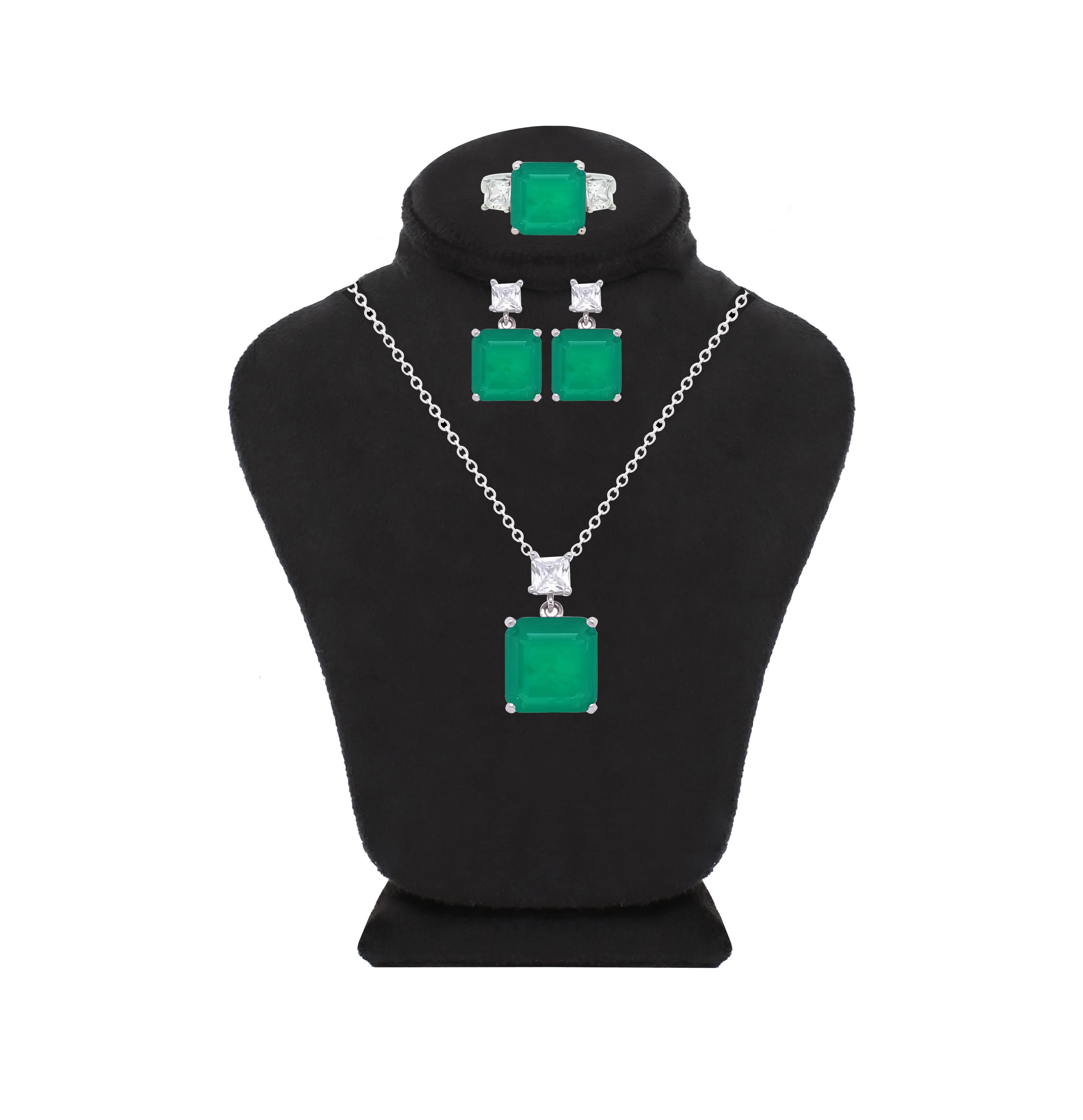 Asfour Crystal Jewelry Set Of Necklace & Earrings & Ring With Emerald Square Design Inlaid With Zircon In 925 Sterling Silver-SD0014-G-8