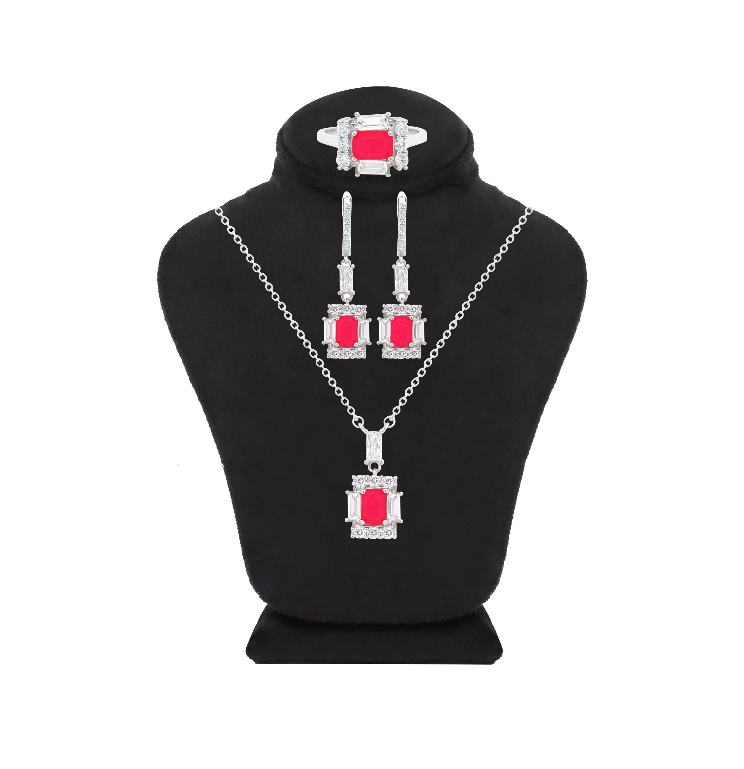 Asfour Crystal Jewelry Set Of Necklace & Earrings & Ring With Ruby Decorative Emerald Design In 925 Sterling Silver-SD0017-R-8