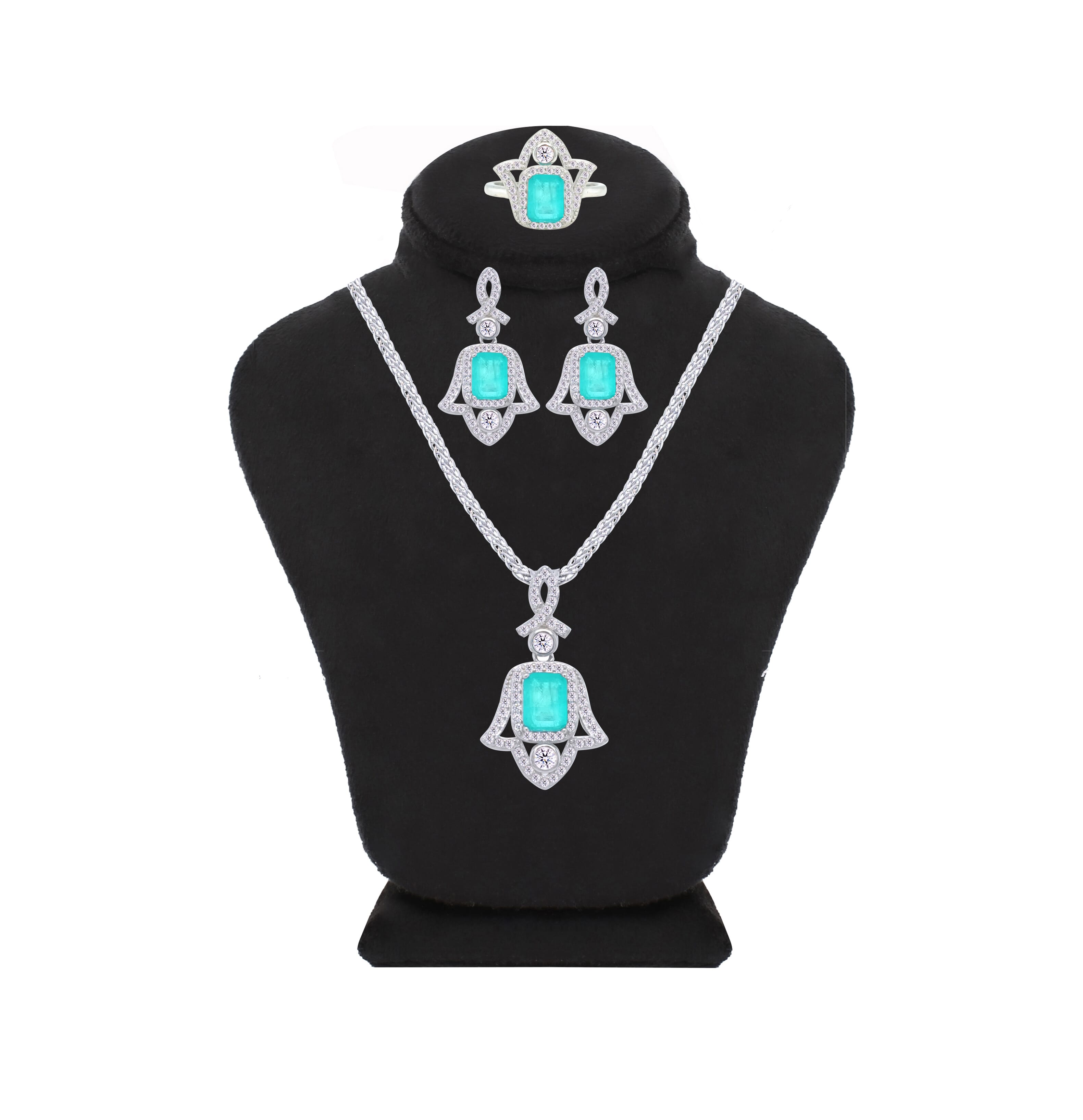 عصفور كريستال طقم فضة عيار 925 بتصميم كف يد ( خمسة ) تركواز فاتح مرصع بفصوص الزركون - SD0053-LGC-9