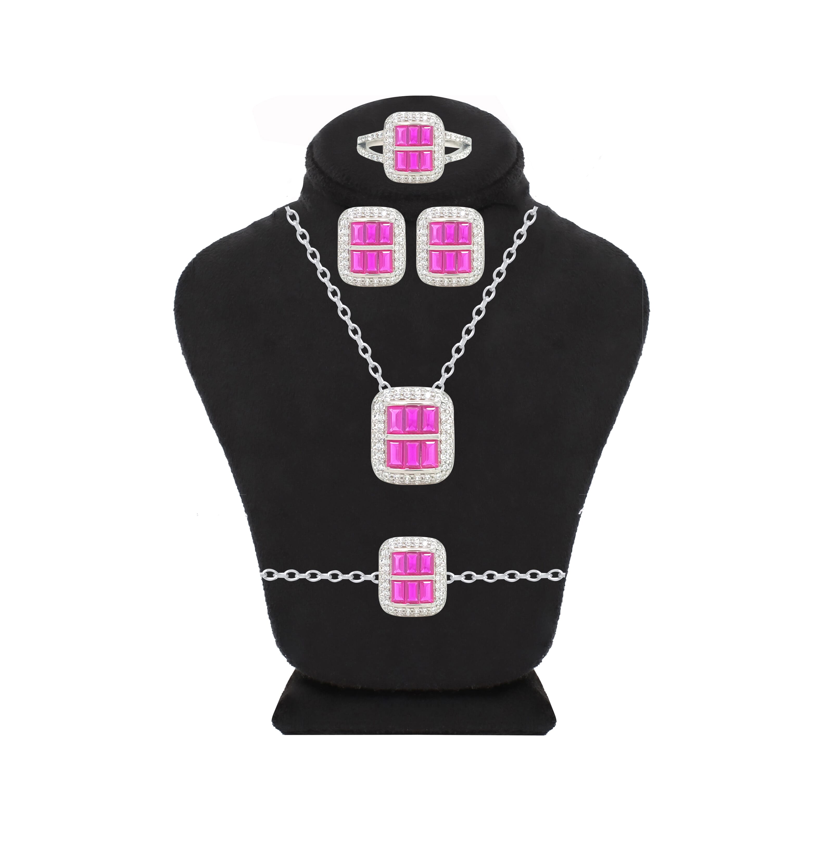 Asfour Crystal Jewelry Set With Fuchsia Square Design In 925 Sterling Silver-SD0028-WF-8