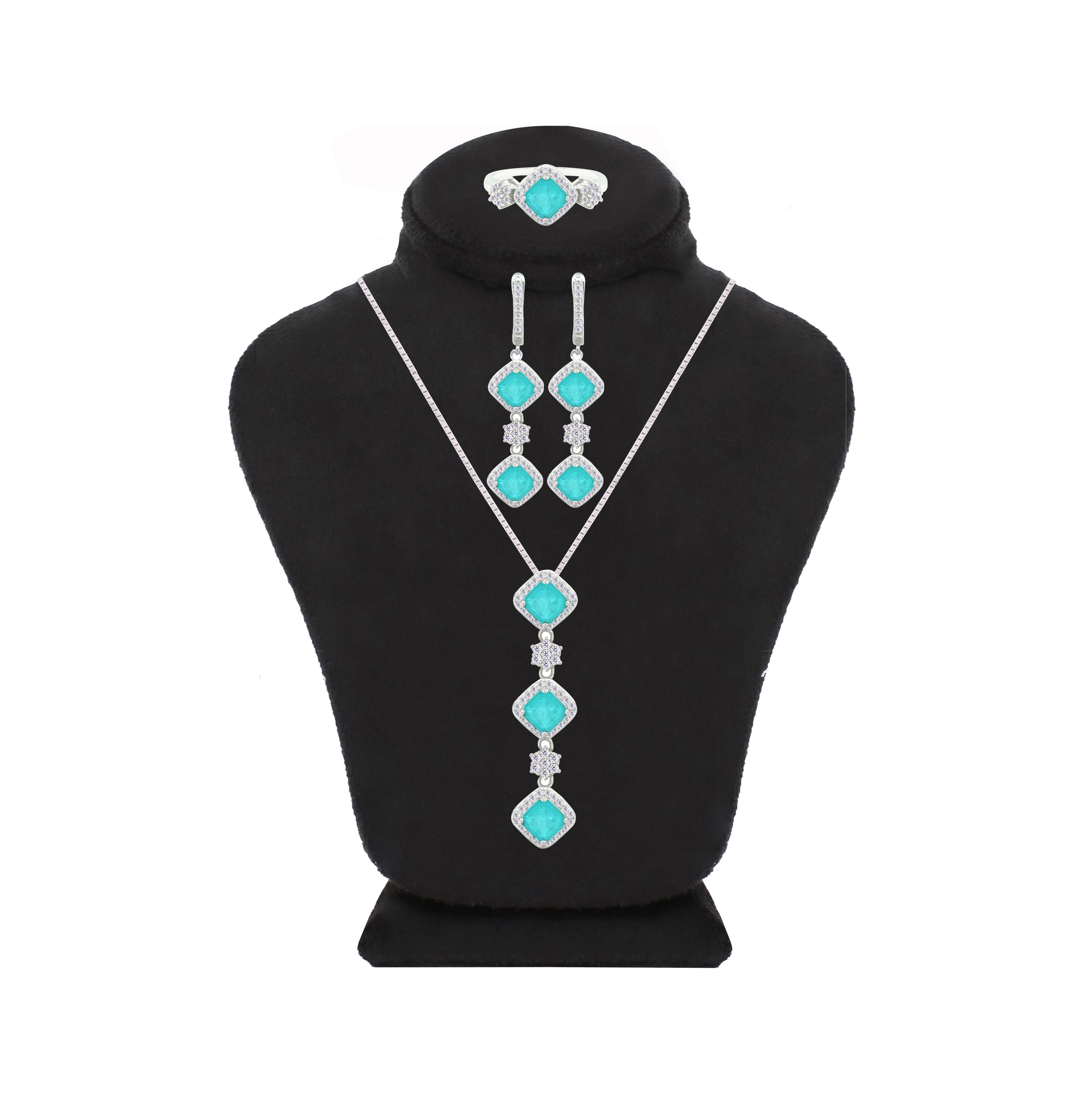 عصفور كريستال طقم فضة عيار 925 بتصميم مربعات لون تركواز مرصعة بالزركون - SD0058-GC-8