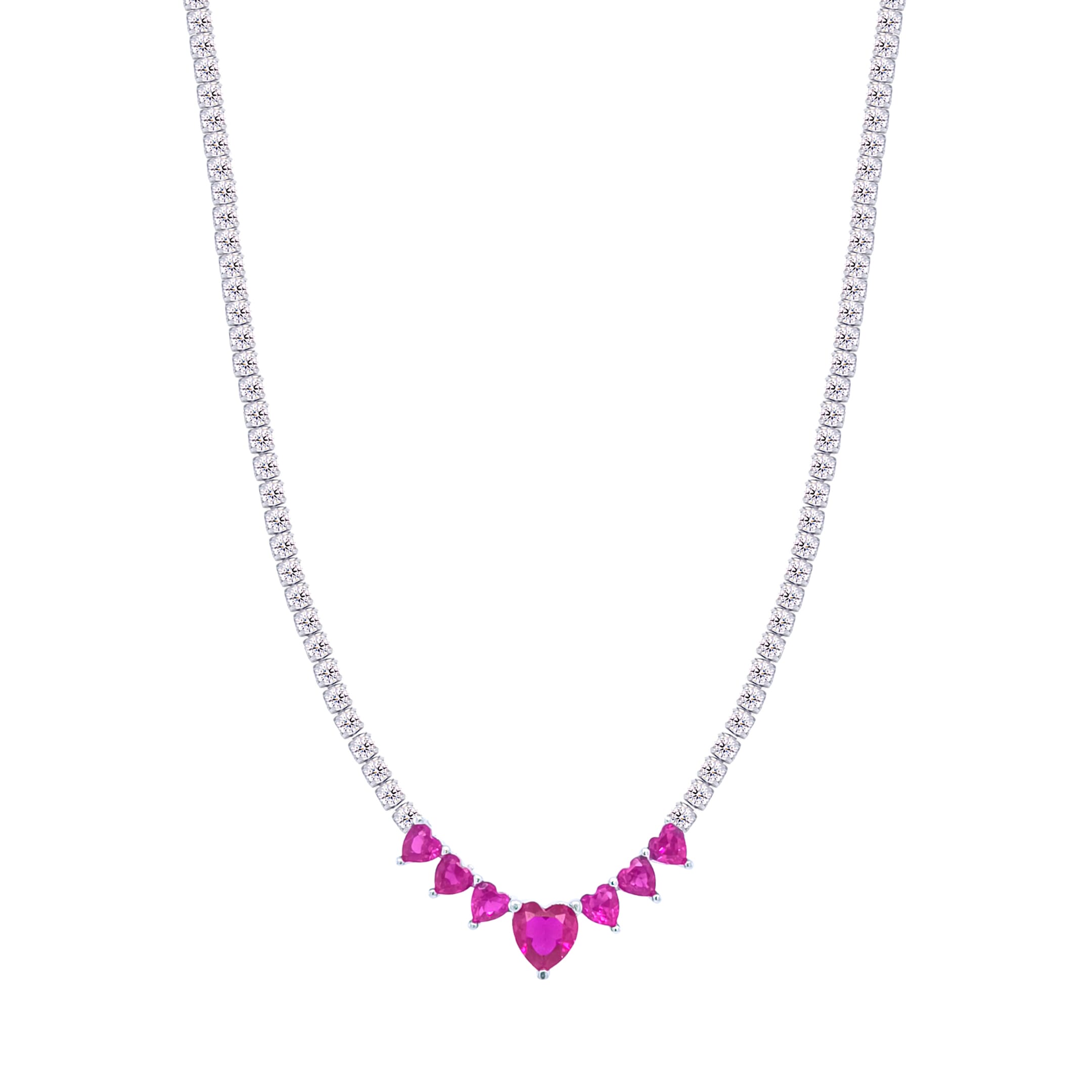 Asfour Crystal Tennis Necklace With Fuchsia Hearts Design In 925 Sterling Silver-ND0431-WF