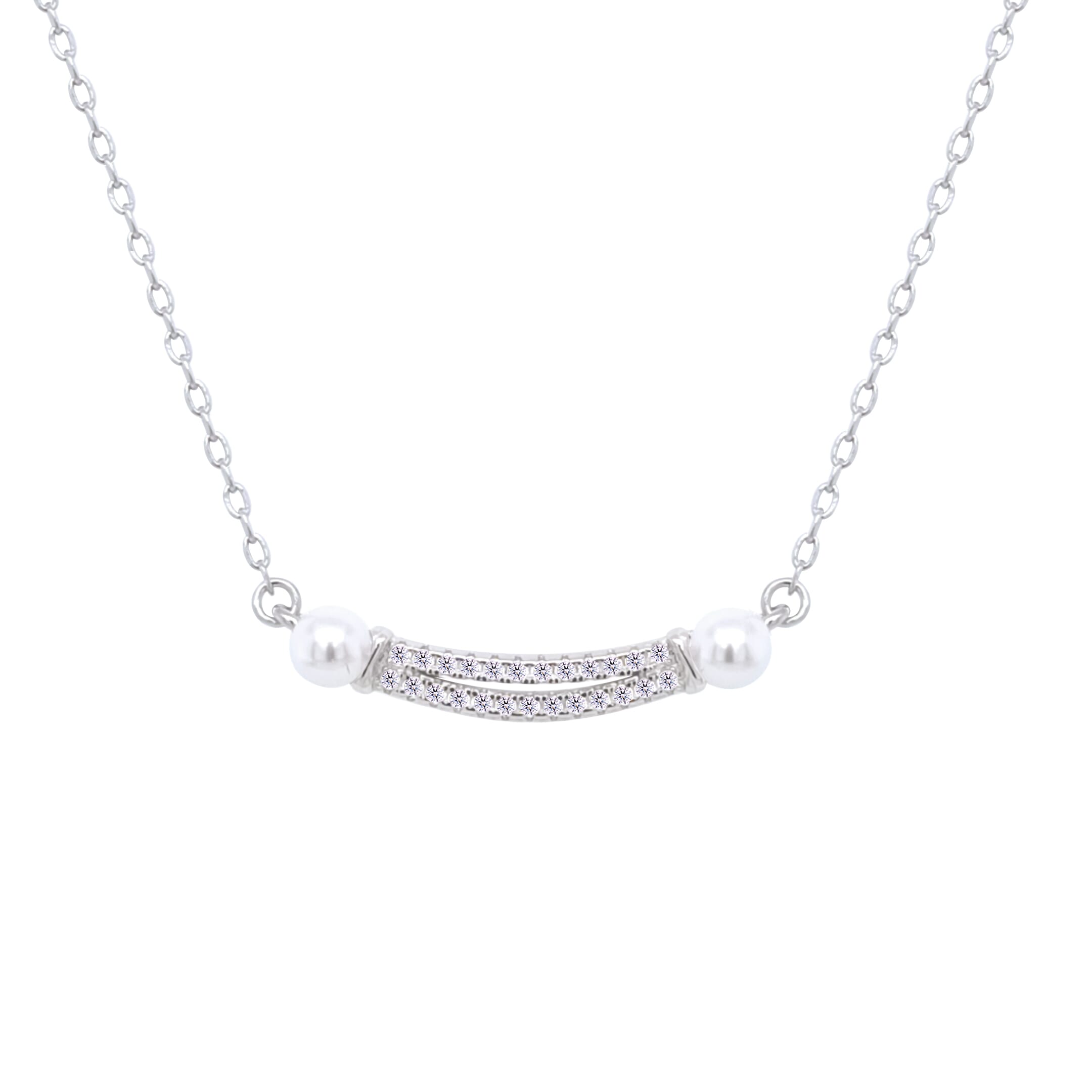 Asfour Crystal Chain NecklaceWith Curve Bar Pendant With Pearl In 925 Sterling Silver-ND0444